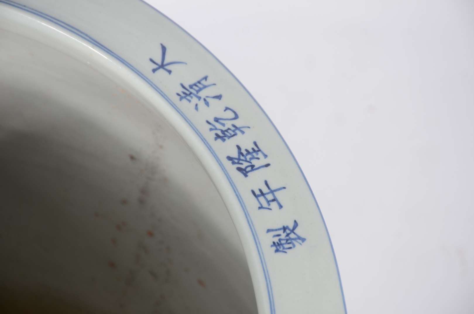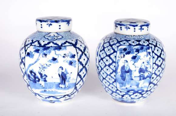 Par de potiches de porcelana chinesa decorados com figuras típicas e guirlandas florais em azul e branco. Assinados n...