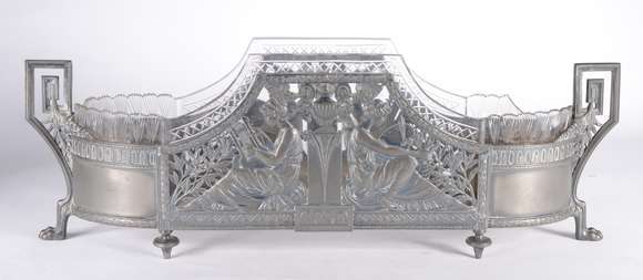 Floreira/centro de mesa de metal prateado, Art Nouveau, decorada com figuras femininas representando a arte da música...