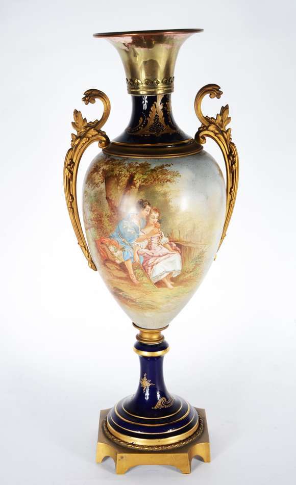 Ânfora de porcelana francesa azul cobalto e dourado, decorada com cena romântica e paisagem em policromia, guarnição ...
