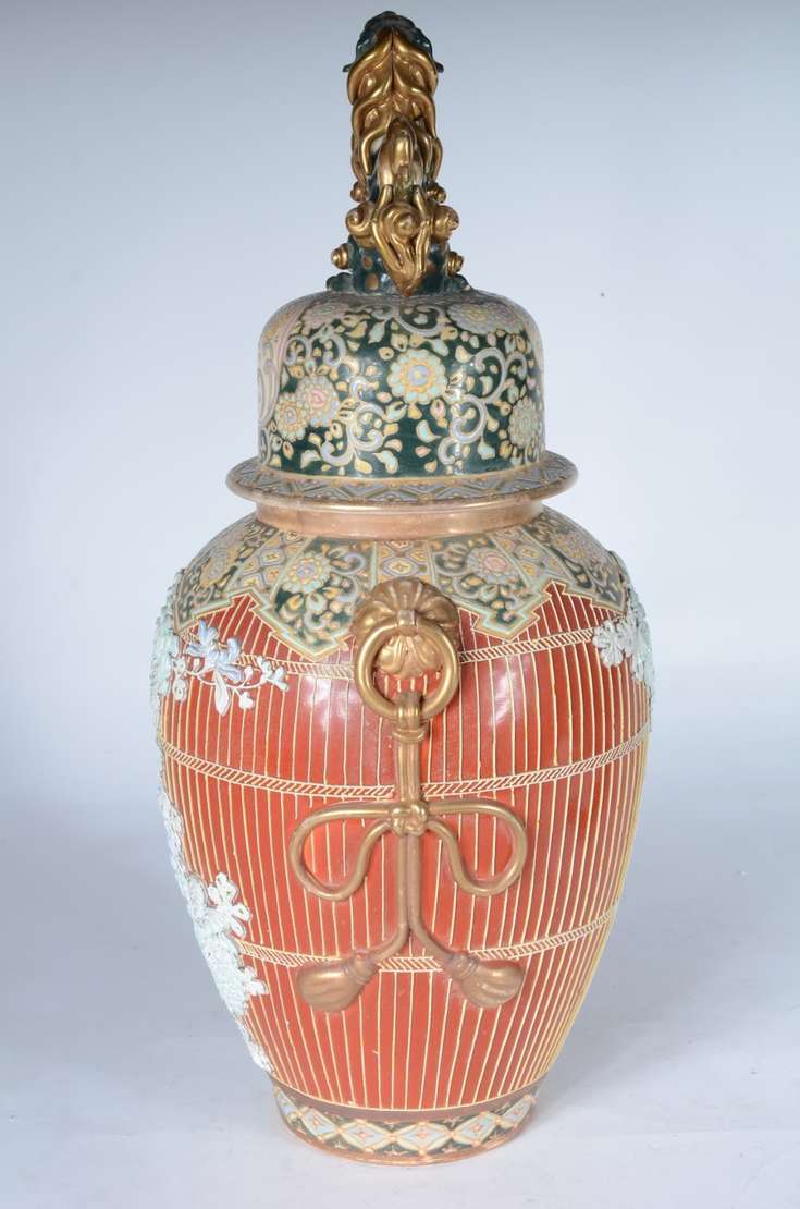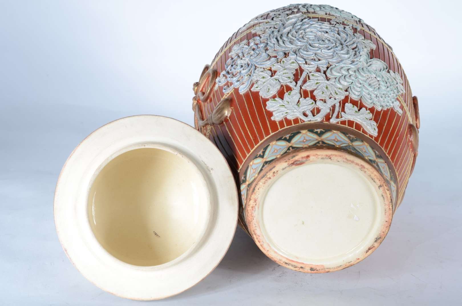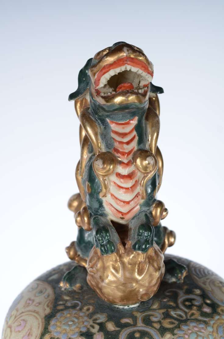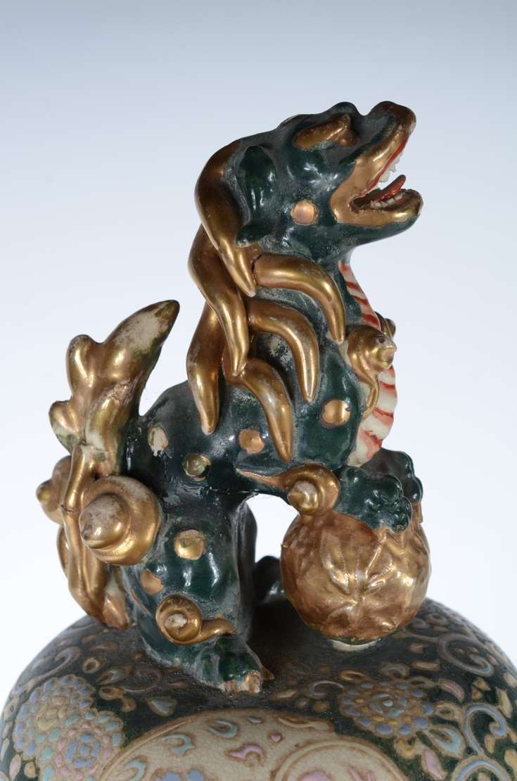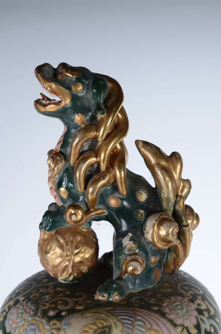 Cachepot de porcelana oriental decorado com cena romântica em policromia, pássaro e guirlandas florais. Acompanha pea...