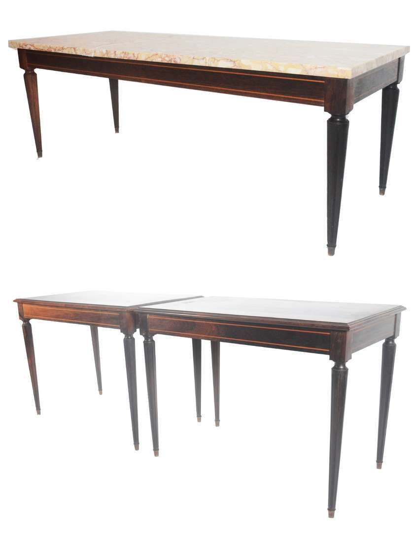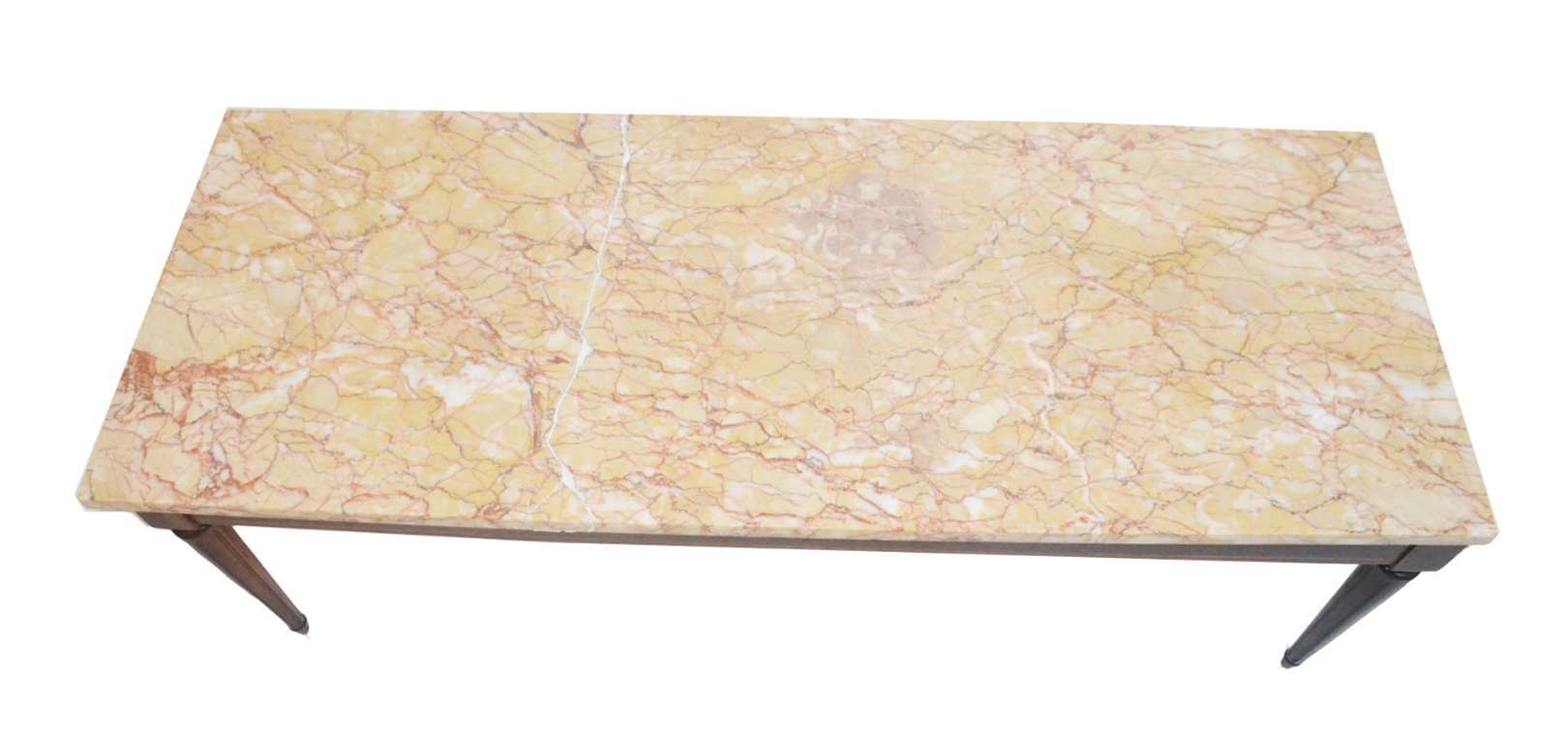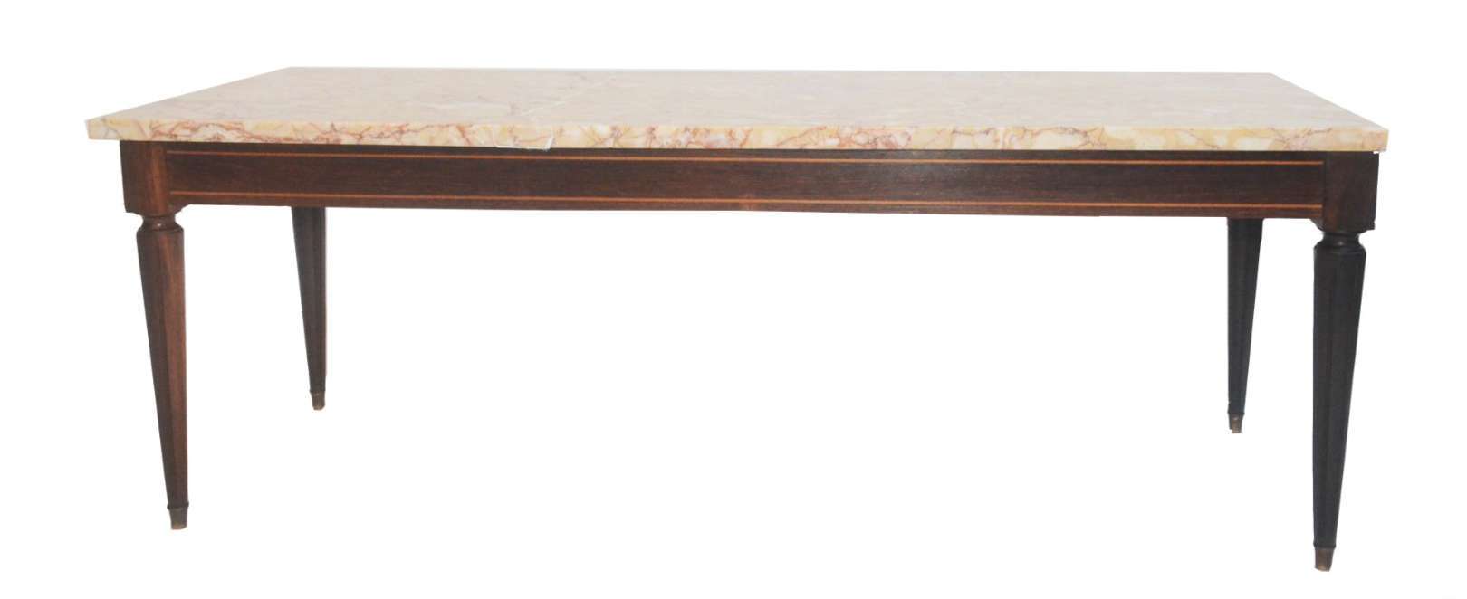 Mesa de centro de madeira nobre, borda recortada com tampo de mármore central, pernas feitio balaústre unidas por tr...