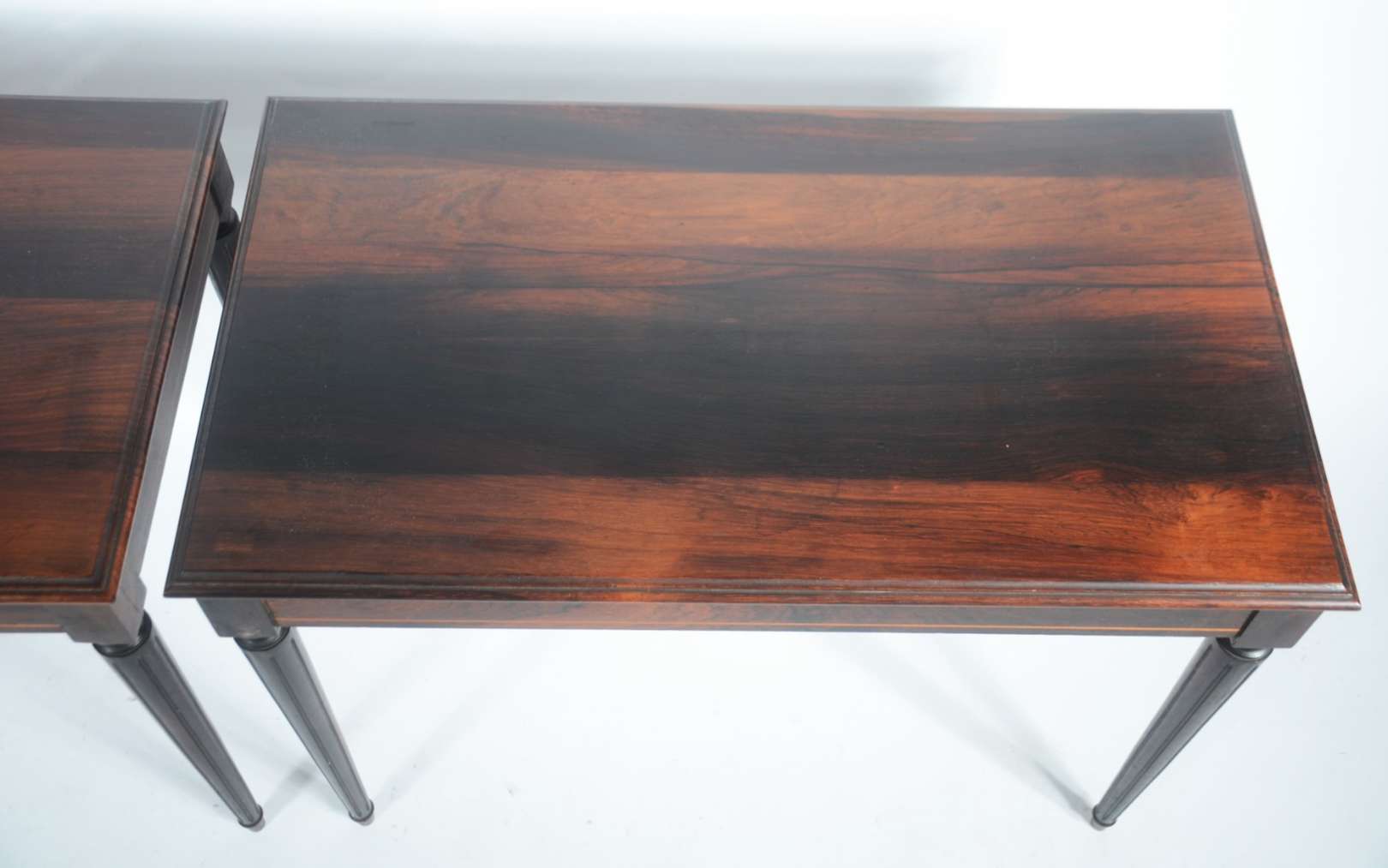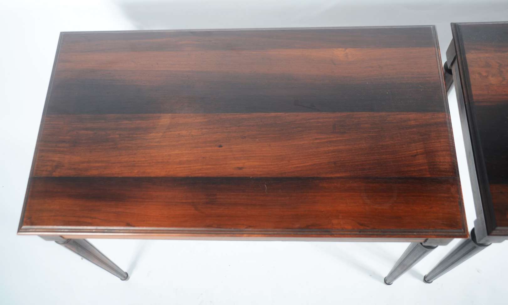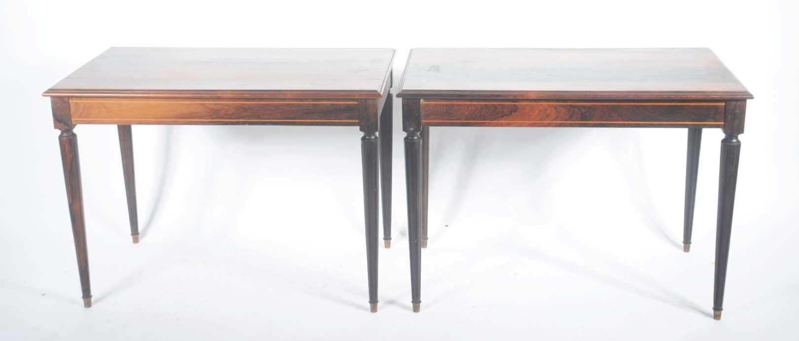 Conjunto com 3 mesas de madeira nobre, sendo par de laterais e uma de centro, esta de modelo ligeiramente diferente, ...