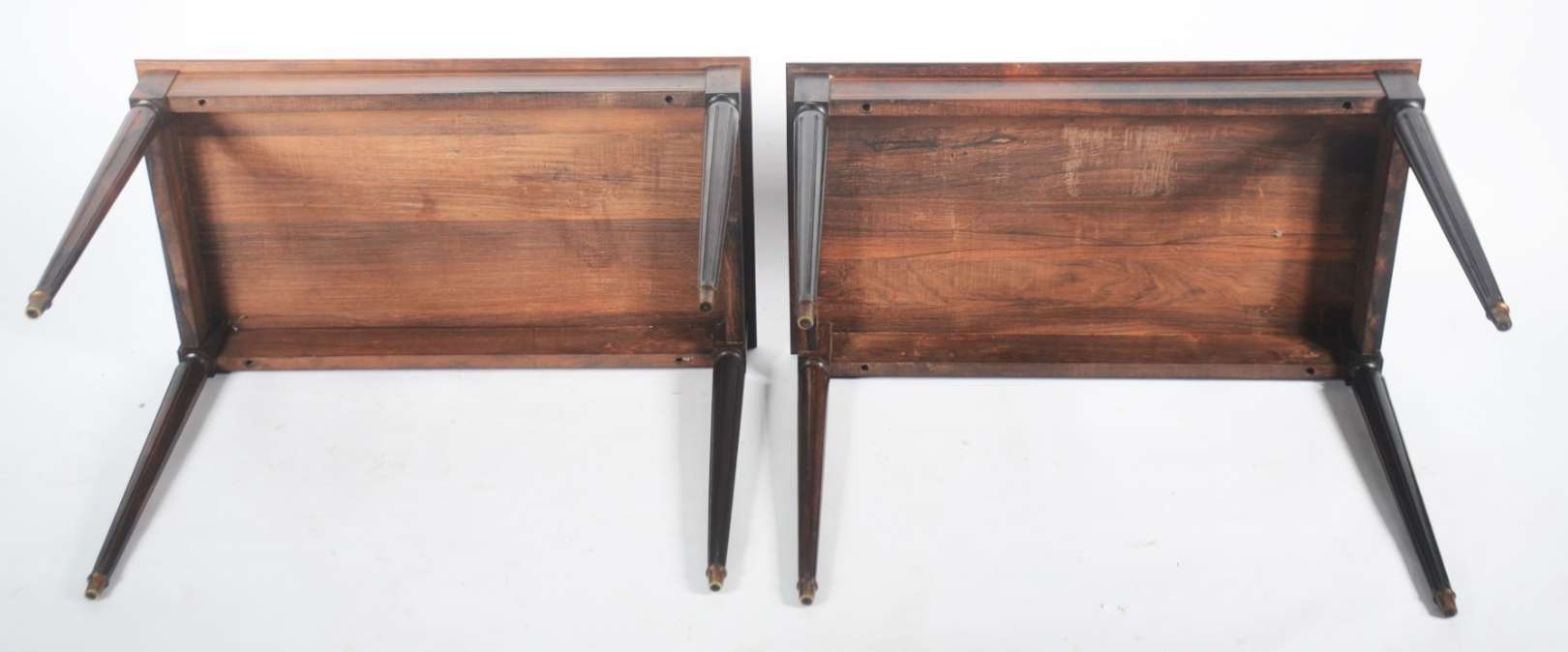 Par de mesinhas laterais de madeira nobre feitio rim, uma gaveta cada, platôs inferiores, gradinha de metal.