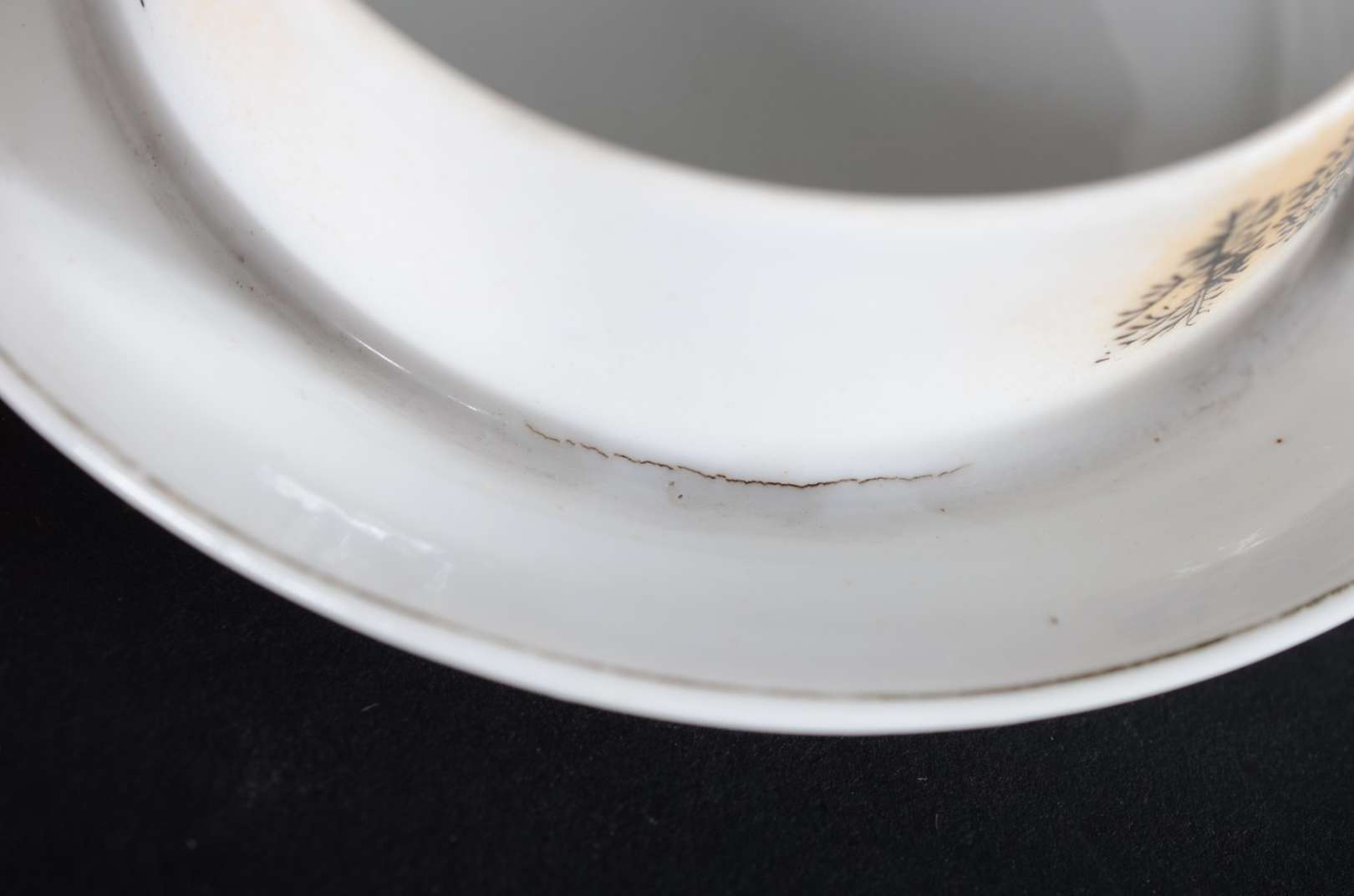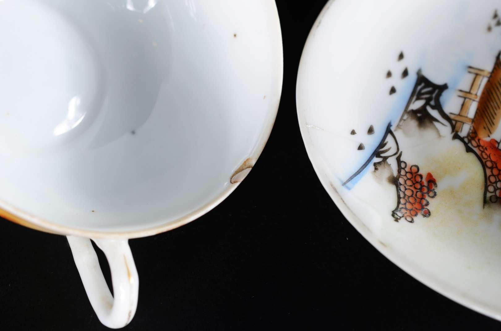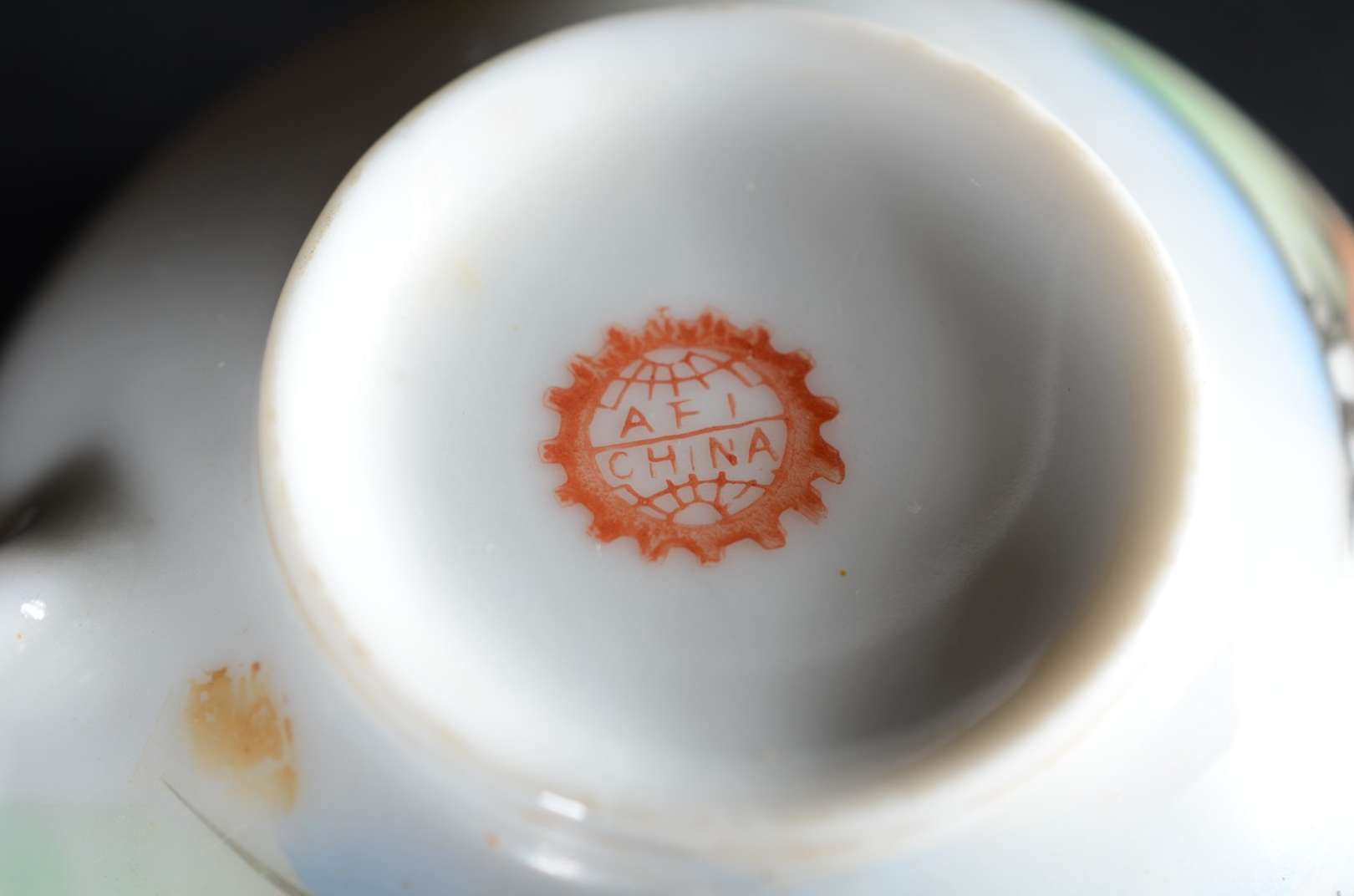 Serviço de chá de porcelana alemã RS, decorado com flores amarelas ao centro e borda com realces dourados e perolados...