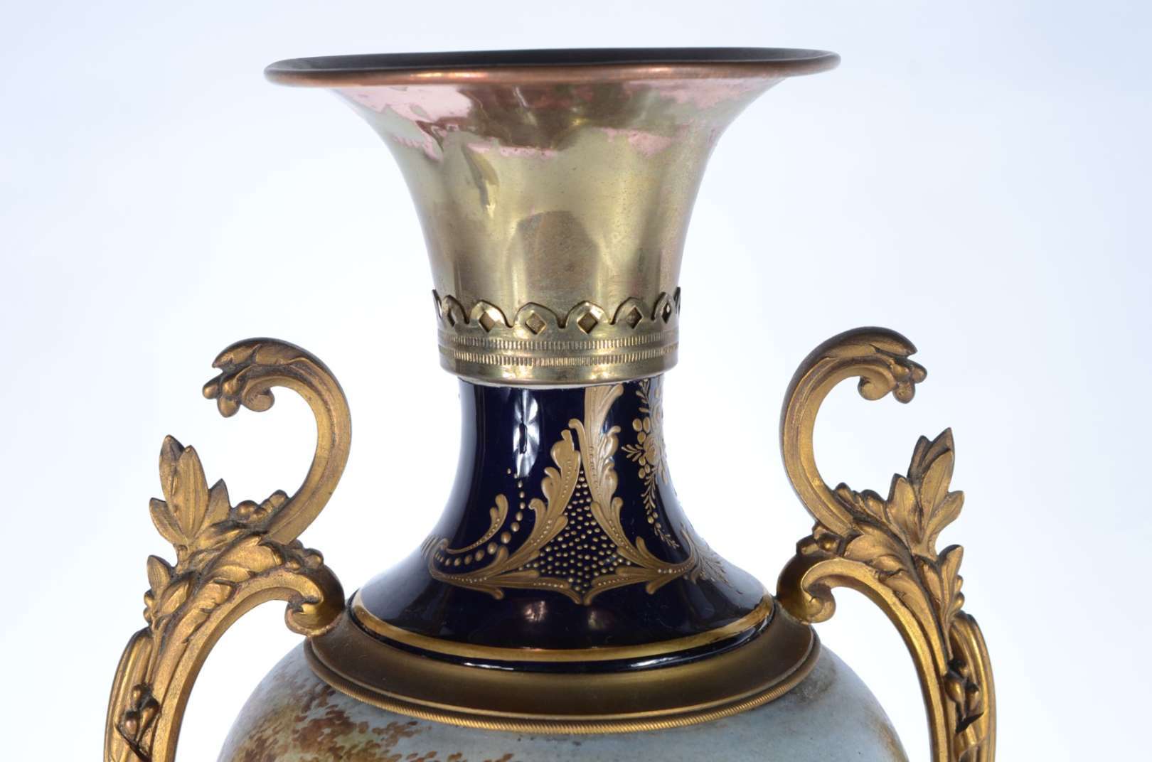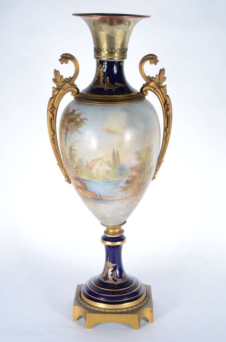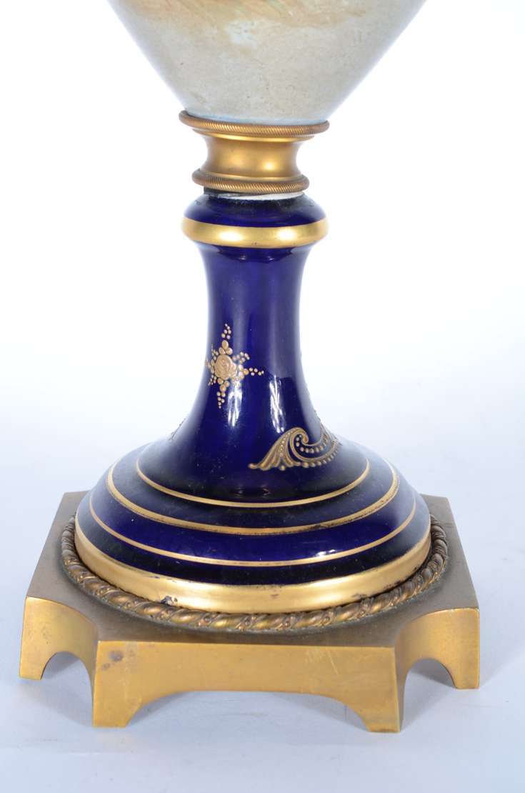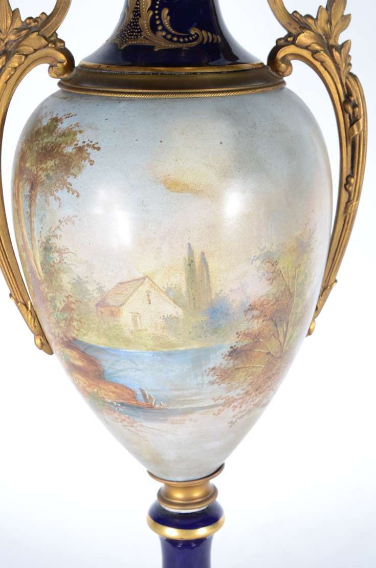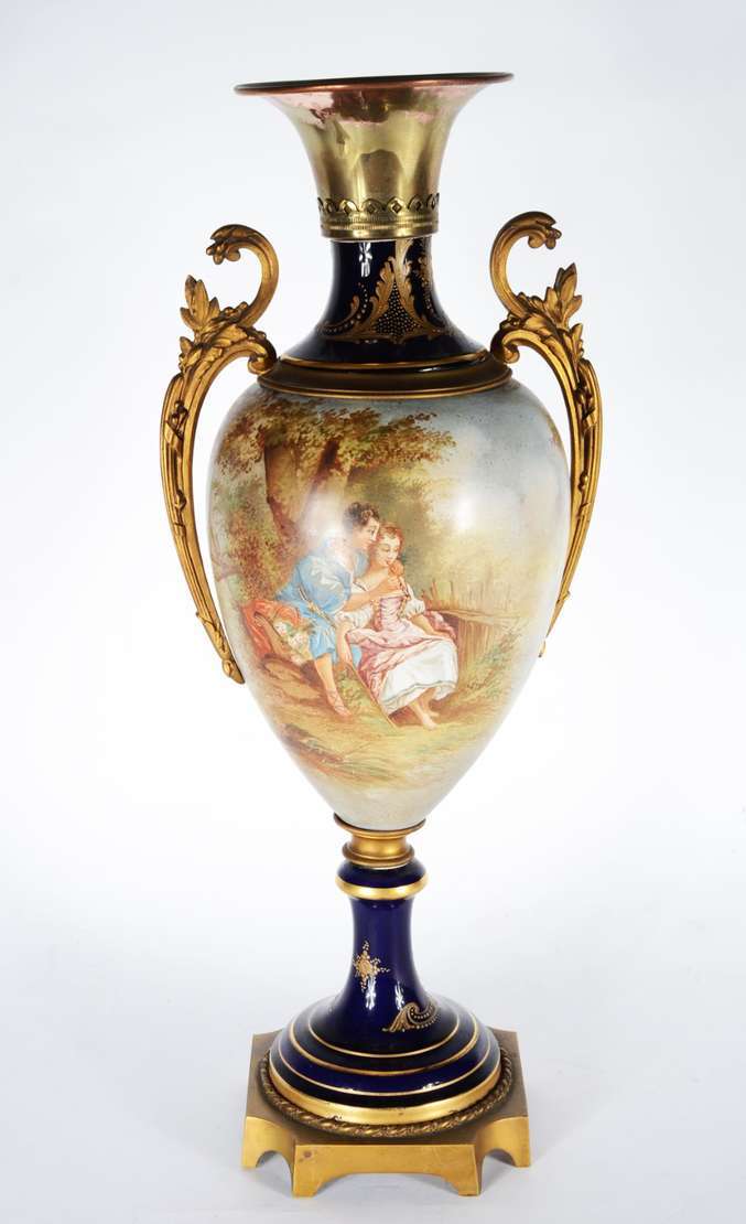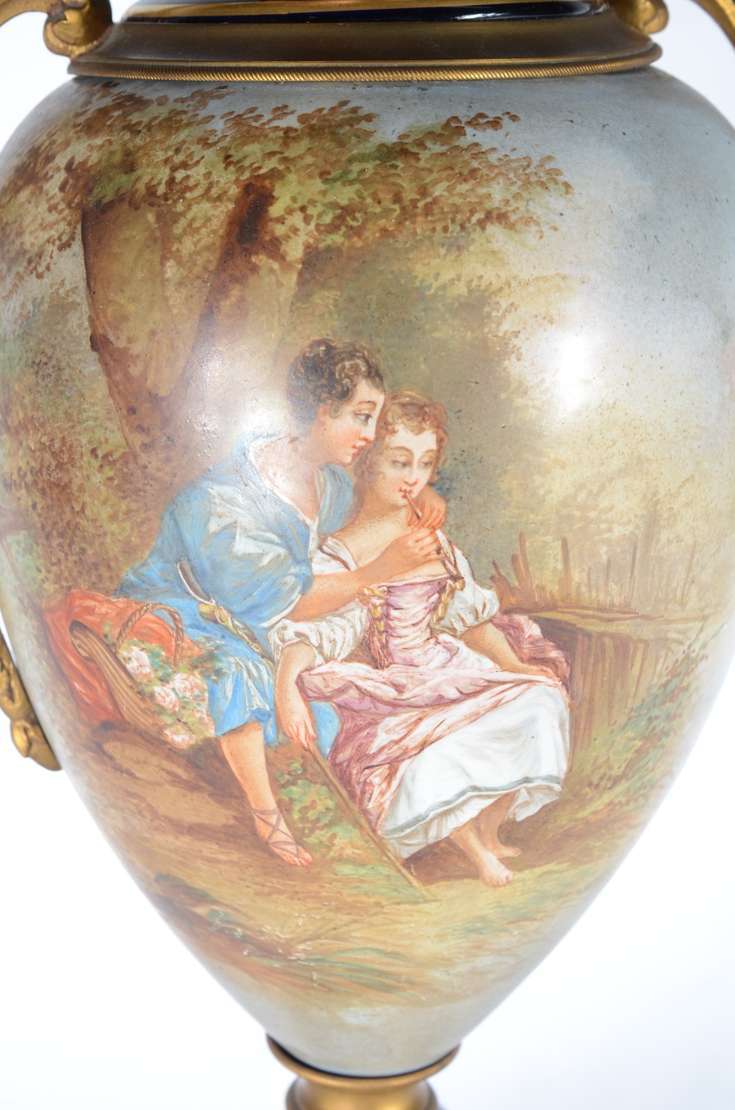 Belíssima "Garniture" de porcelana francesa de Sèvres, composto de tres potiches, decorados com cenas românticas em p...