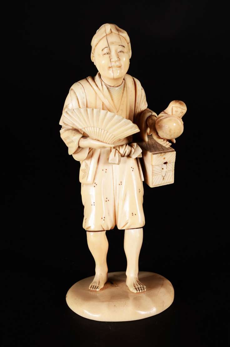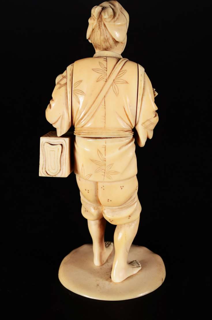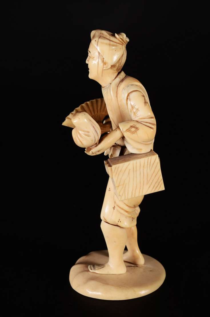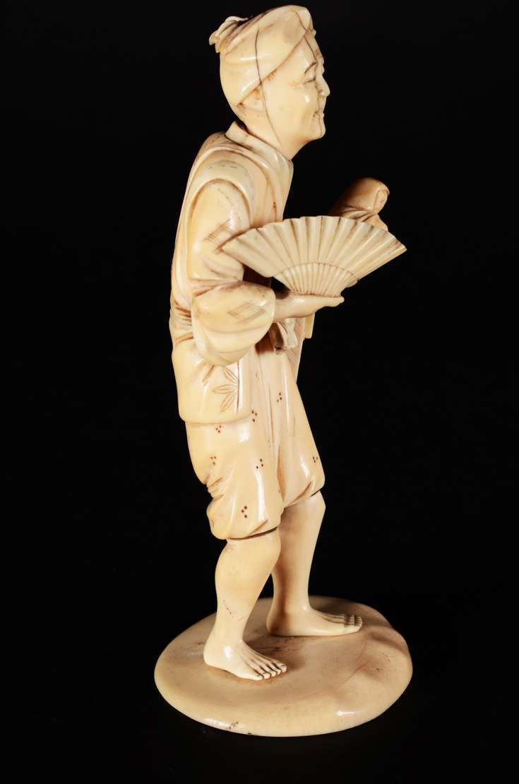 Escultura de marfim chines representando figura típica com leque e cesto. Pequenos defeitos.