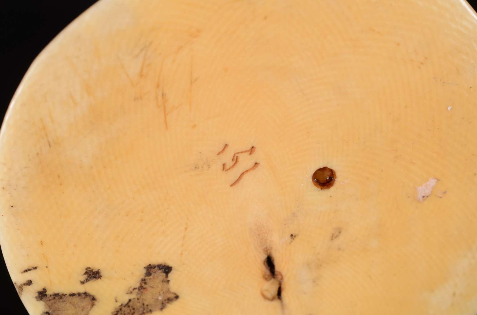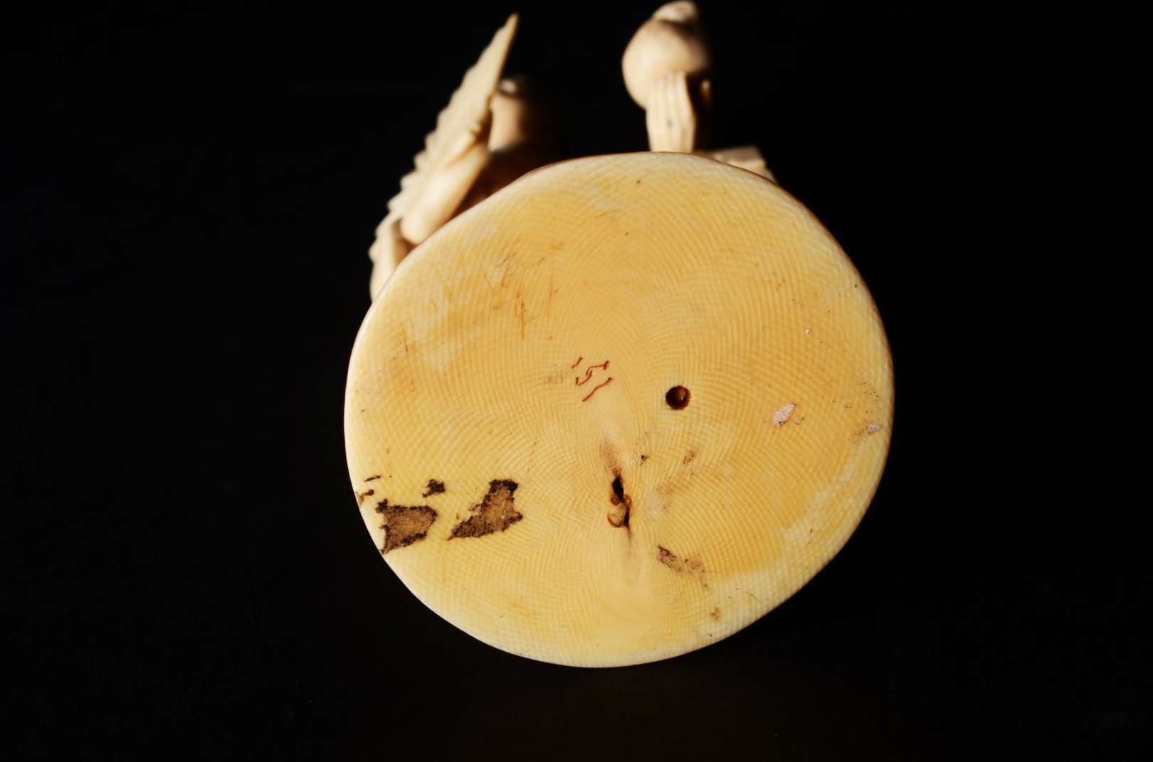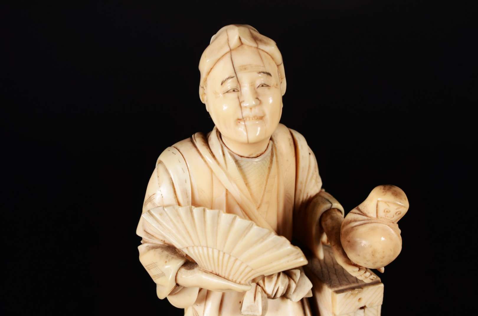 Escultura de marfim chines representando figura típica com leque e cesto. Pequenos defeitos.