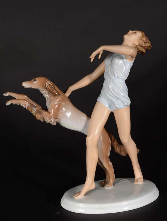 Grupo escultórico de porcelana alemã Rosenthal representando figura feminina com cachorro. Uma das patas do cachorro ...