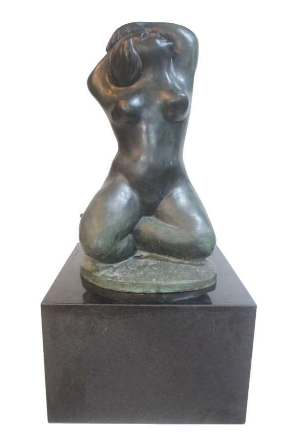 Escultura de bronze patinado representando figura feminina, base em granito. Década de 60. Selo da fundição Zani.