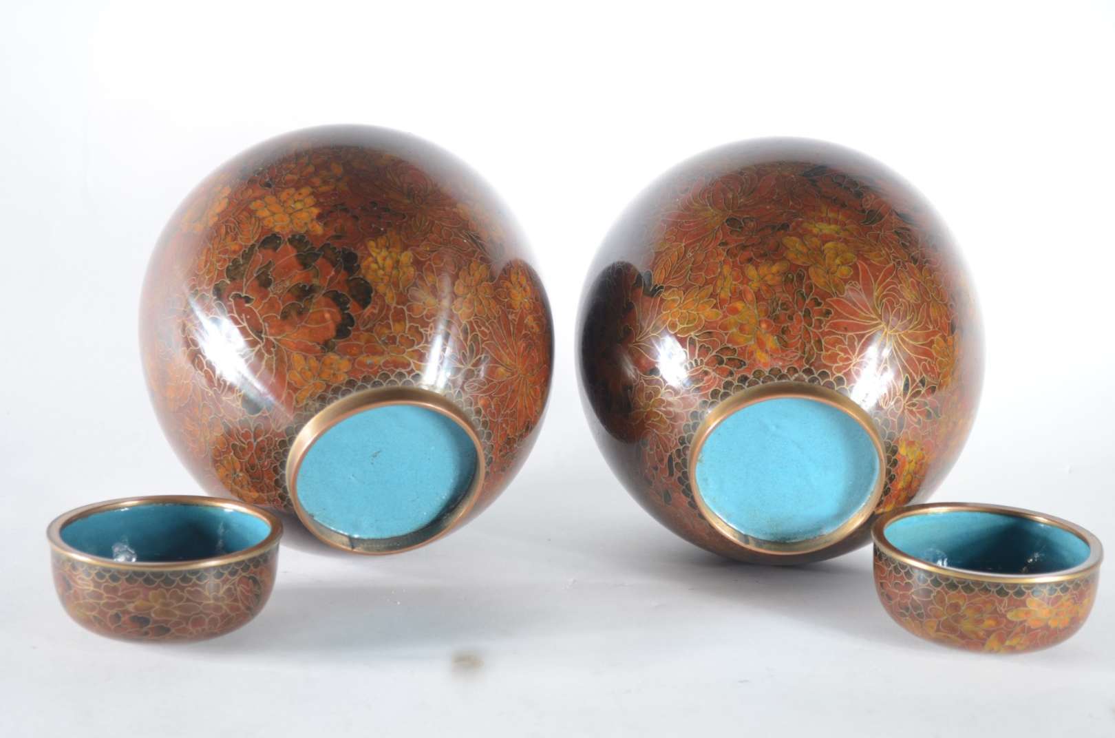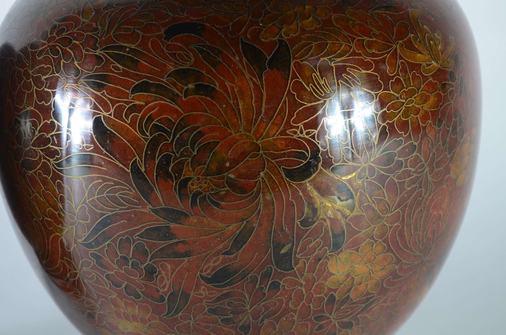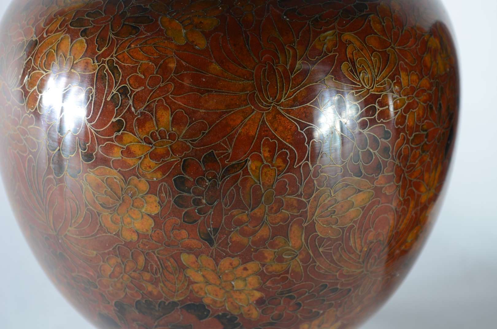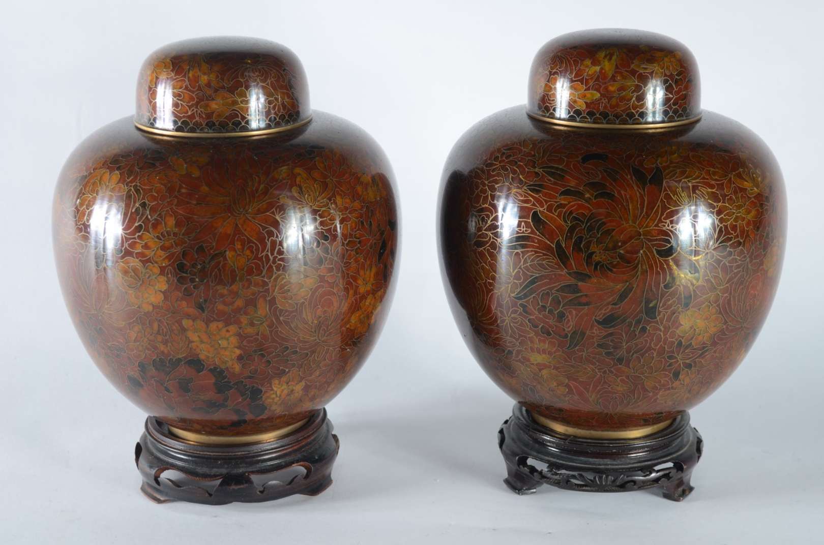 Par de vasos de cloisoné chines, decoração floral em policromia sobre fundo rouge de fer. Bases de madeira.