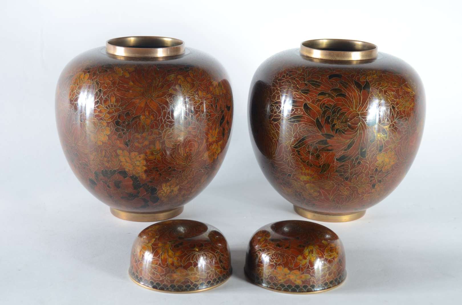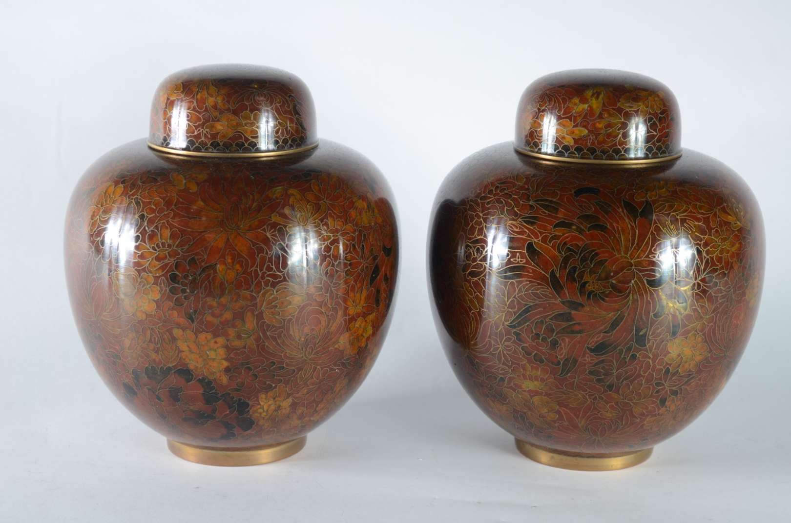 Par de potiches de cloisoné chines floral em policromia sobre fundo branco, feitio arredondado.