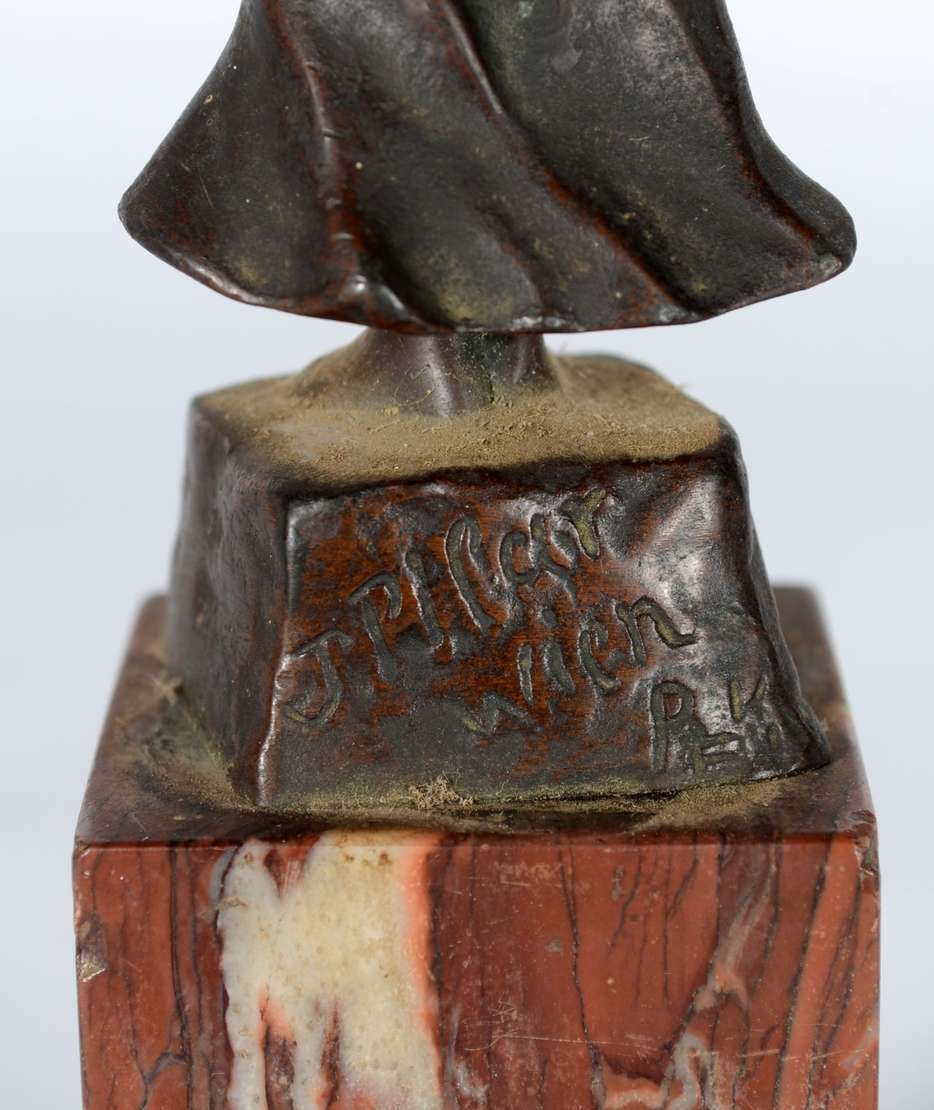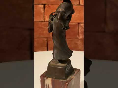 Escultura feita em presa de marfim com pássaro em relevo e inscrições árabes. Base de madeira. Desgastes nas bordas.
