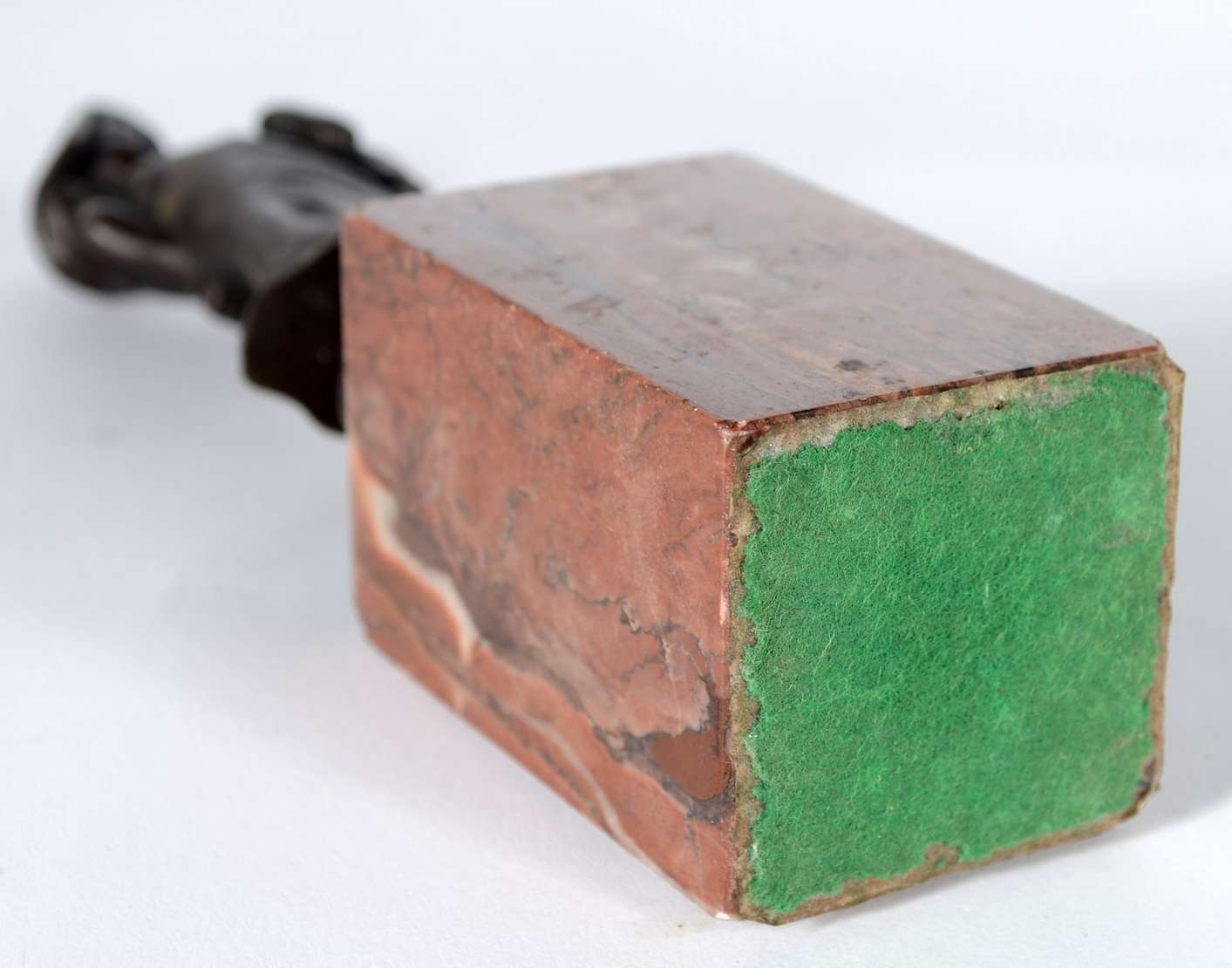 Grande presa esculpida com figuras de animais, base de madeira. Pequenos desgastes na borda.