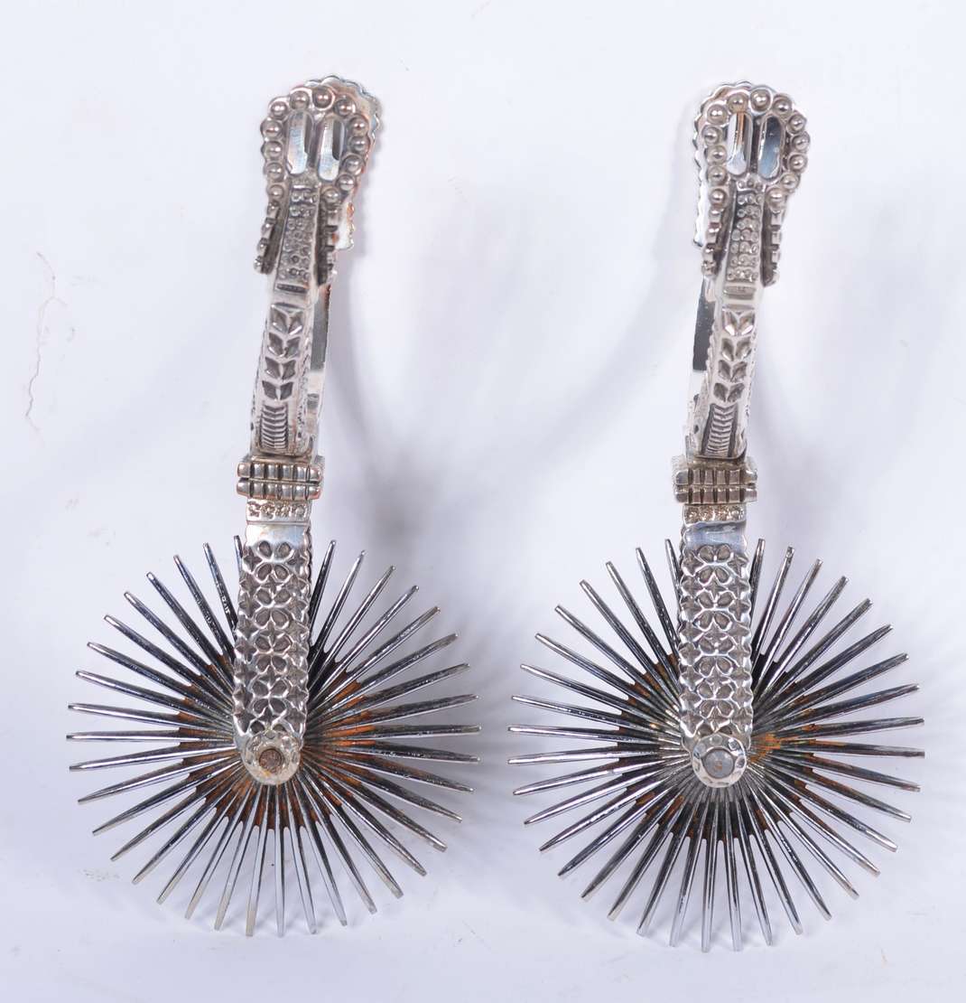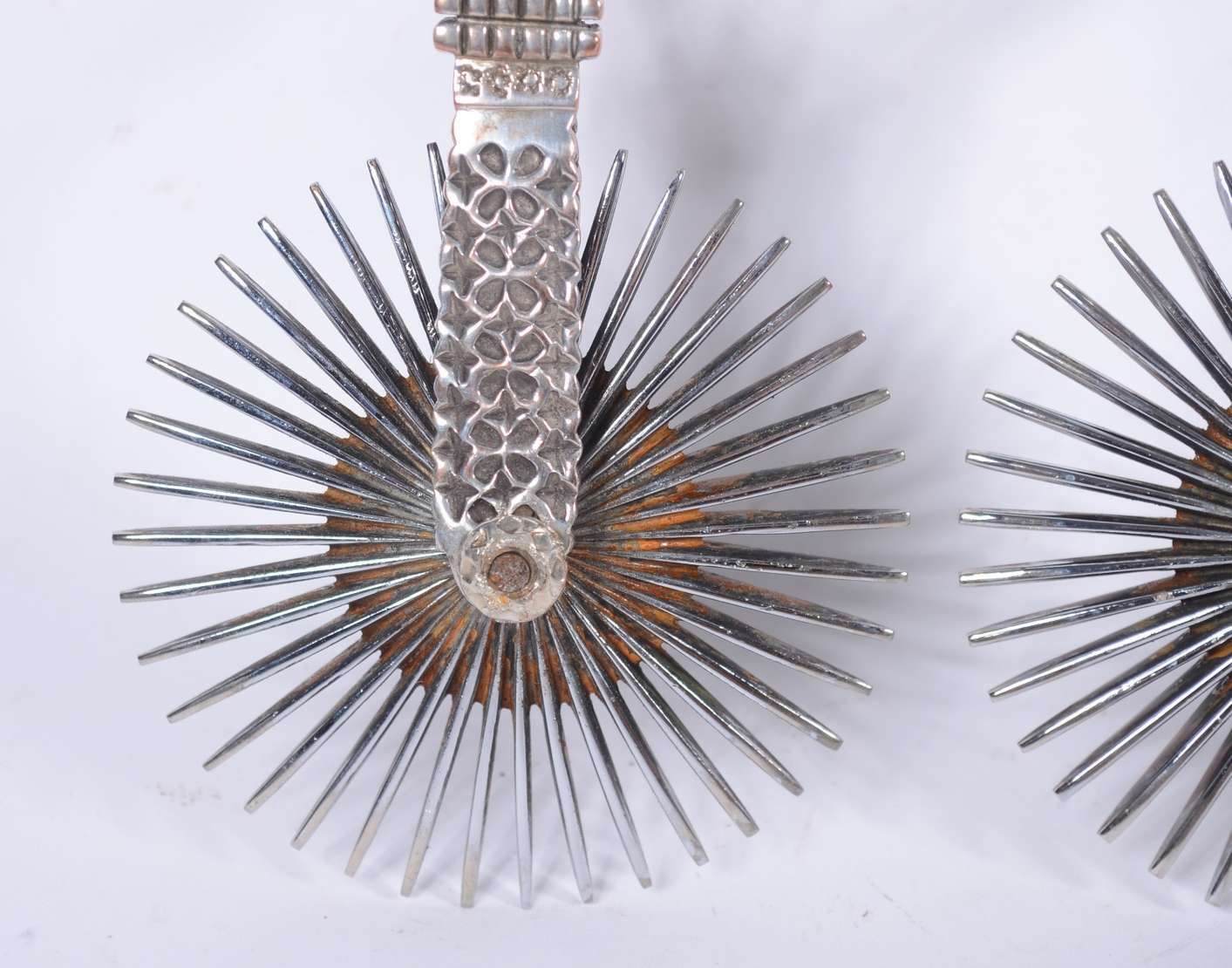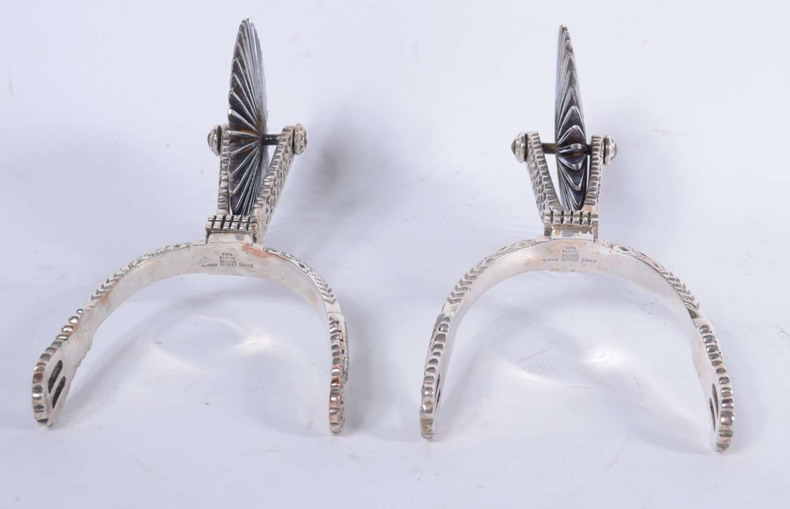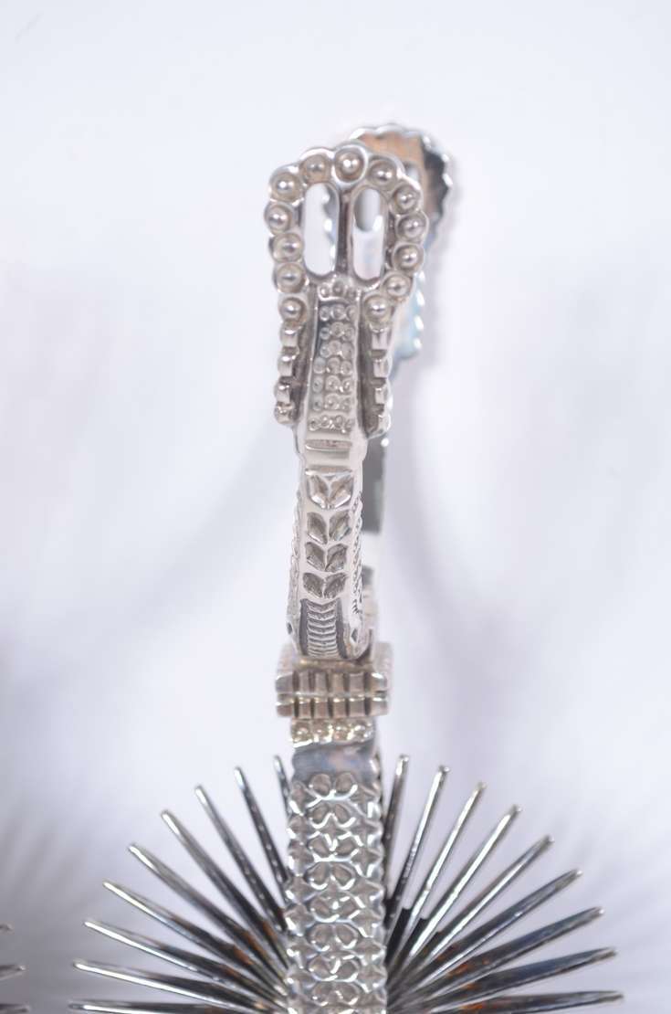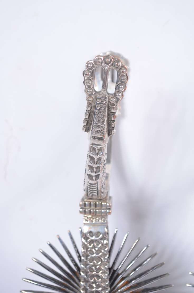 Par de esporas de prata chilena, 900 mls, Casa Barros. A parte giratória "raiada" é de metal. No estojo. Peso da prata: 400 g. (Por motivos de segurança a peça não se encontra na loja).