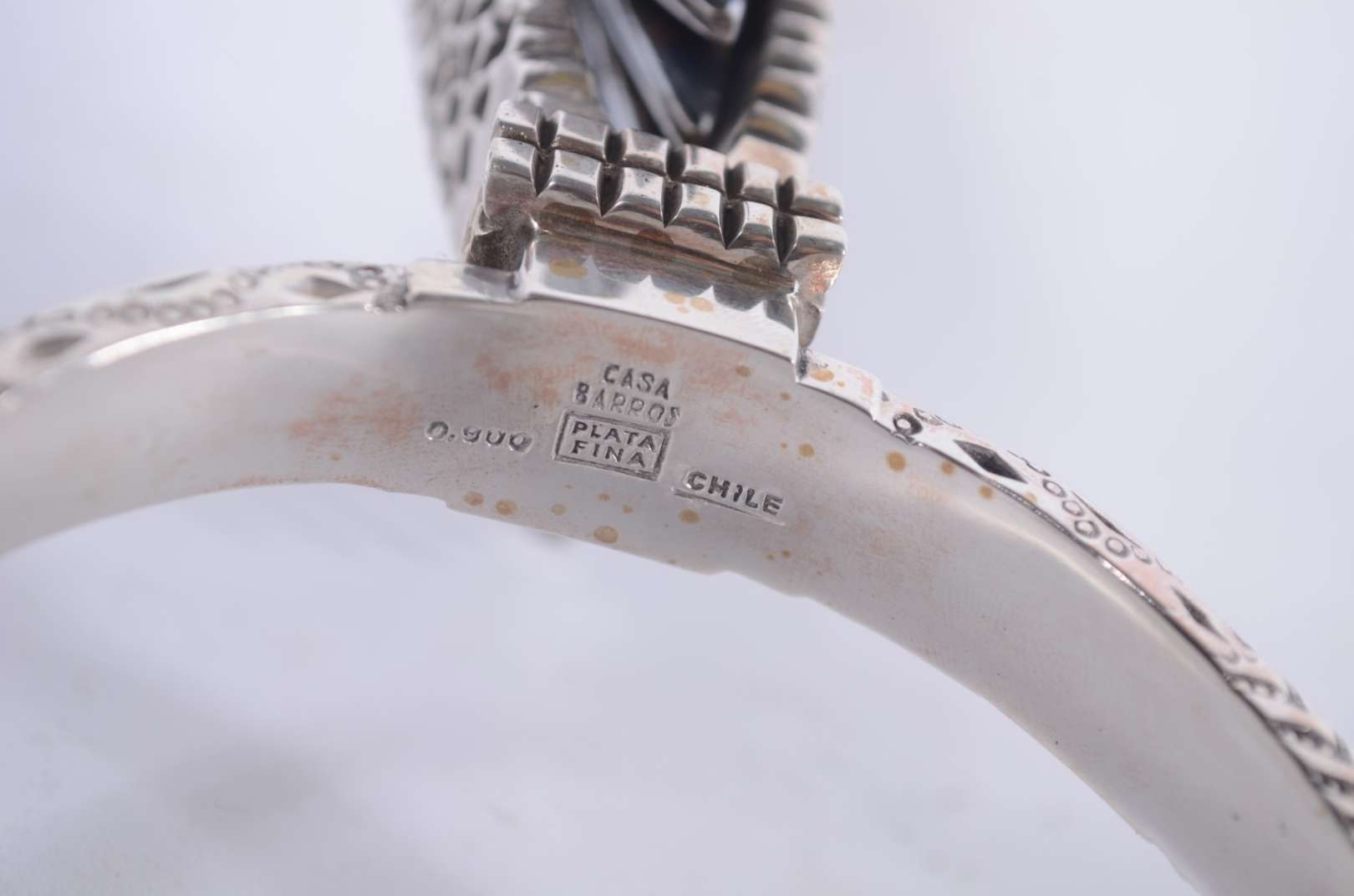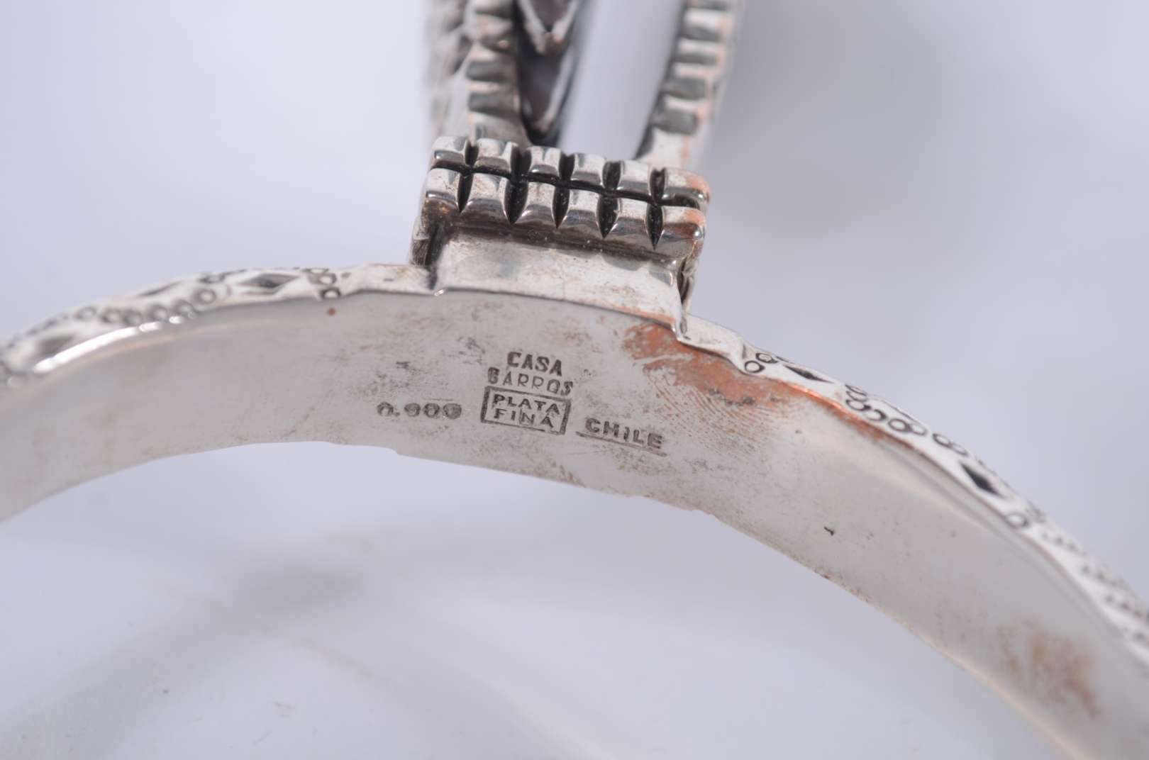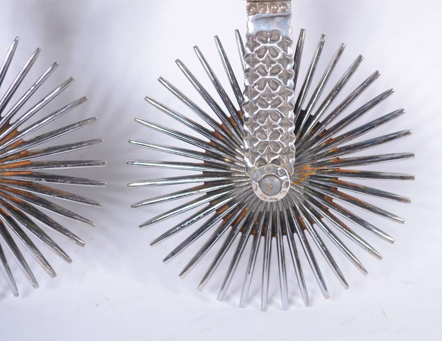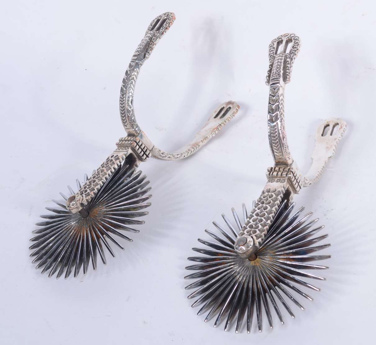 Par de esporas de prata chilena, 900 mls, Casa Barros. A parte giratória "raiada" é de metal. No estojo. Peso da prata: 400 g. (Por motivos de segurança a peça não se encontra na loja).