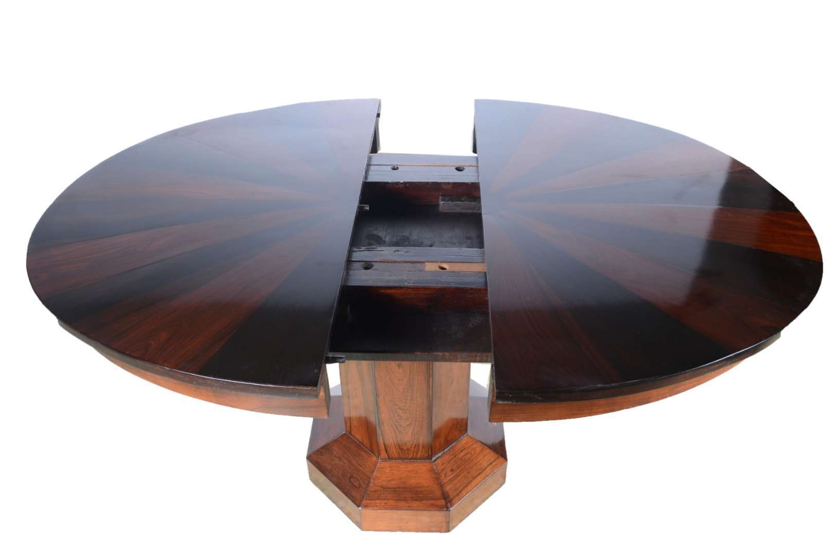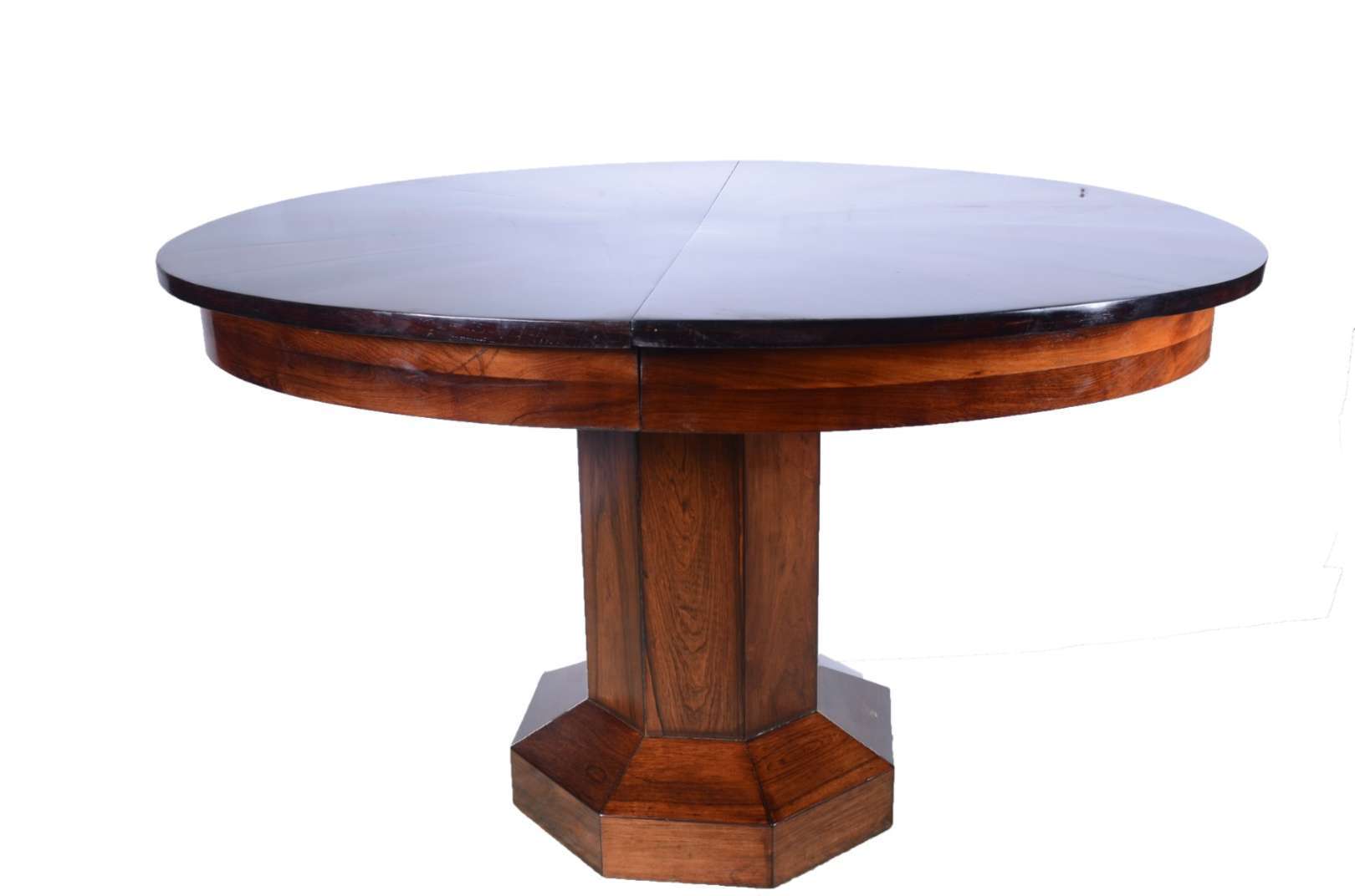 Mesa de jantar de jacarandá, tampo retangular apoiado em bases com duplo balaústres canelados terminando em tres pern...