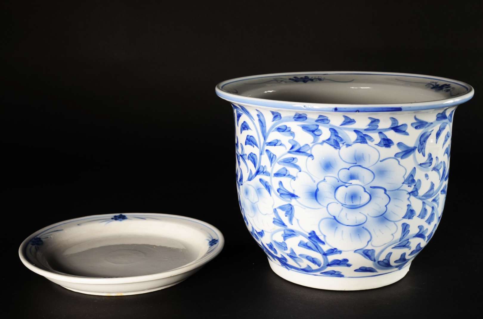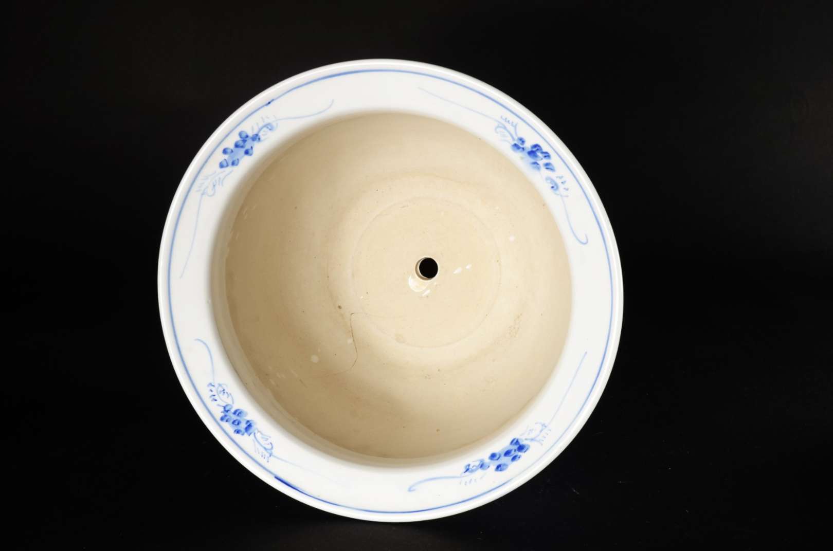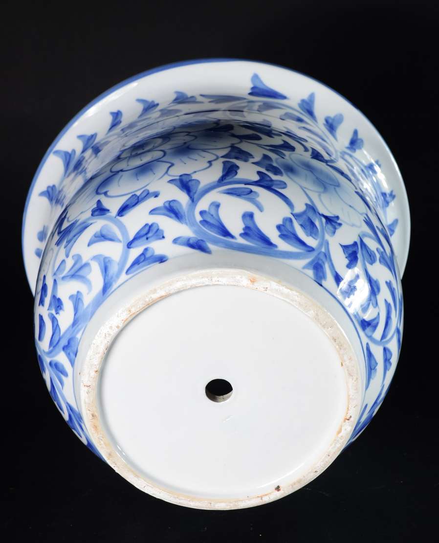 Cachepot de porcelana oriental azul e branca, feitio sextavado.