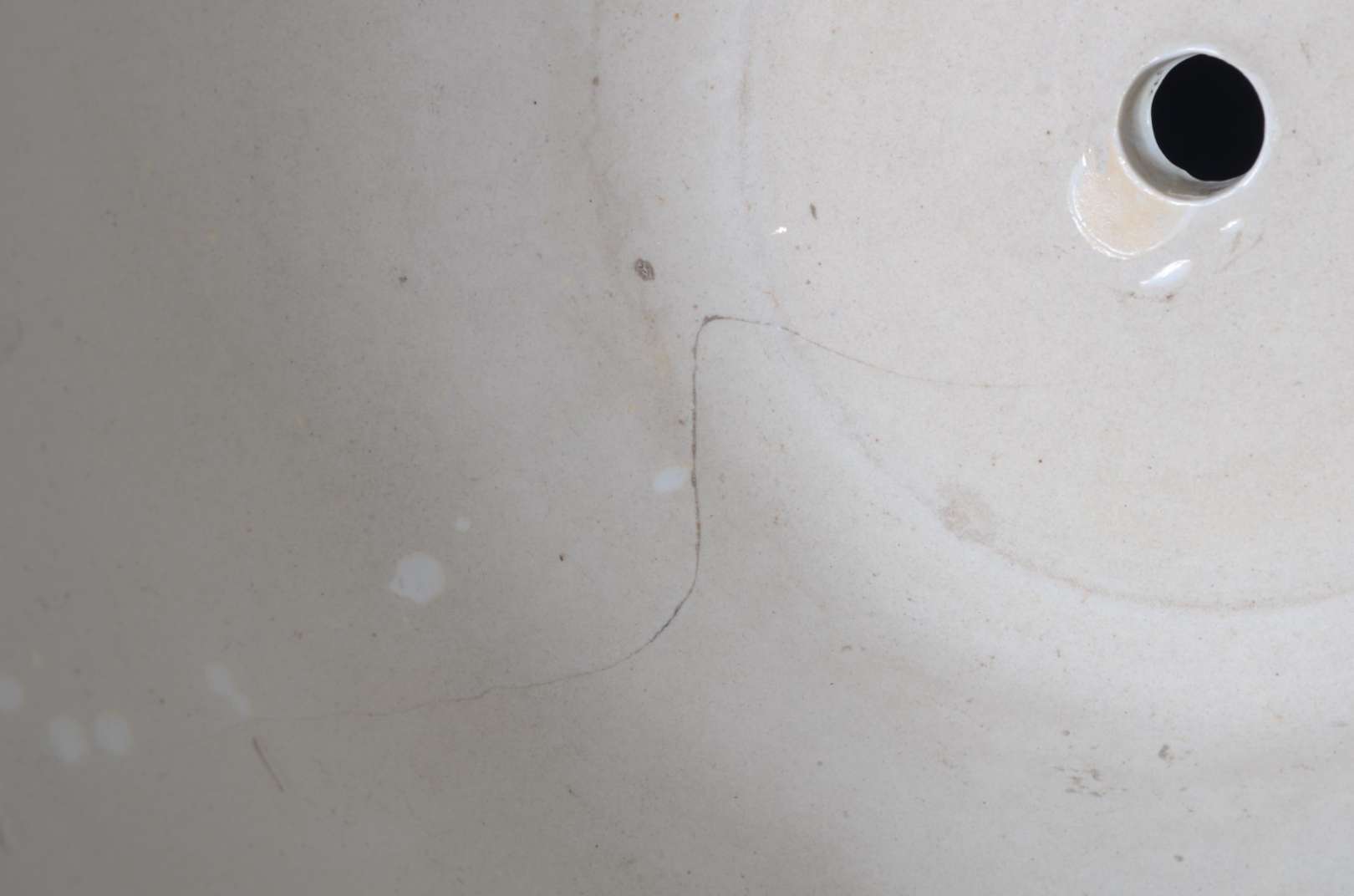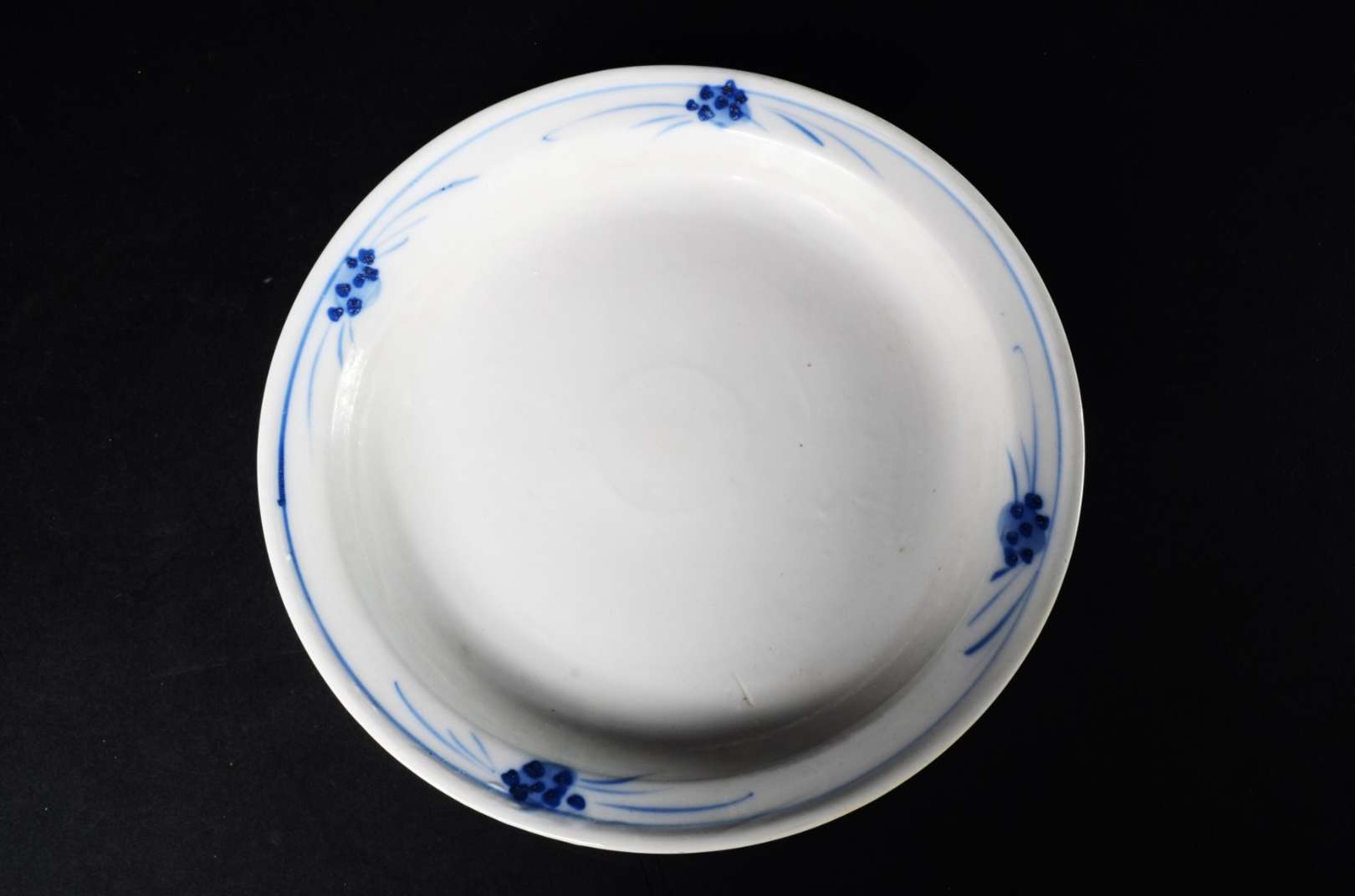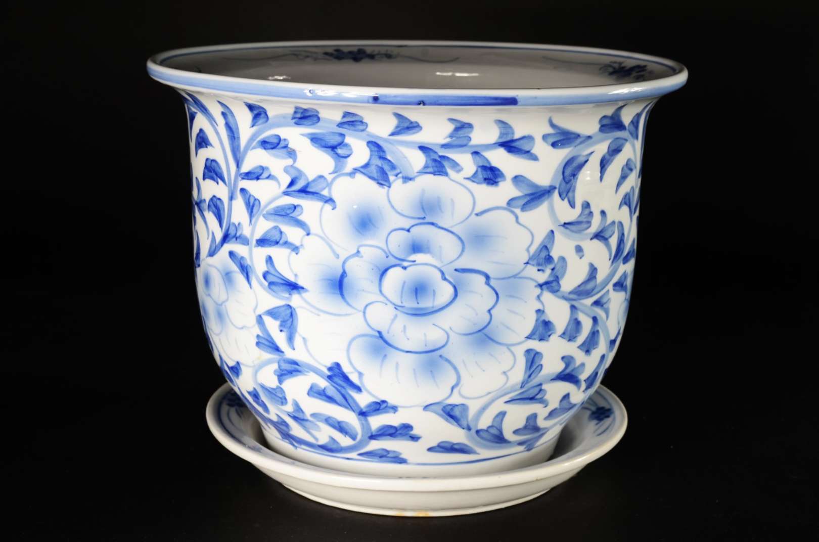 Cachepot de porcelana oriental azul e branca, feitio sextavado.