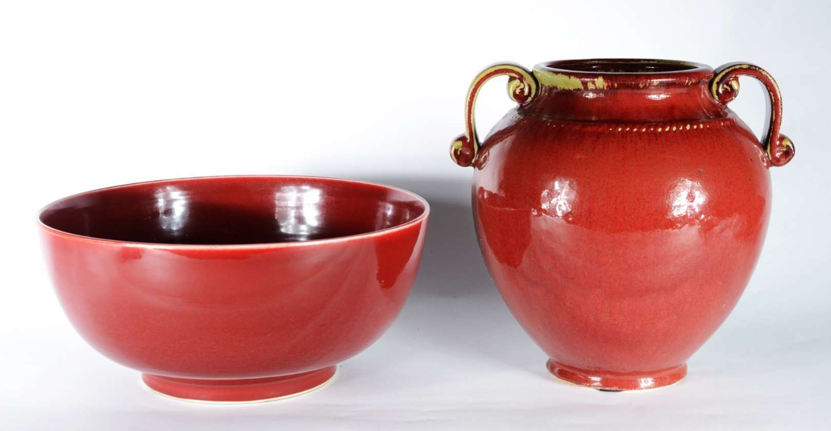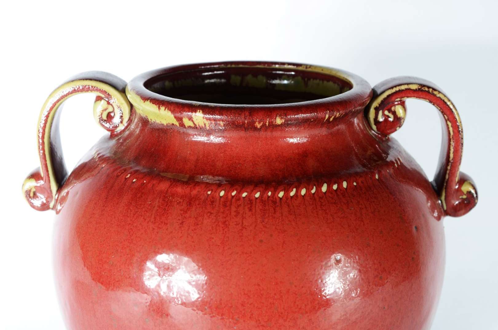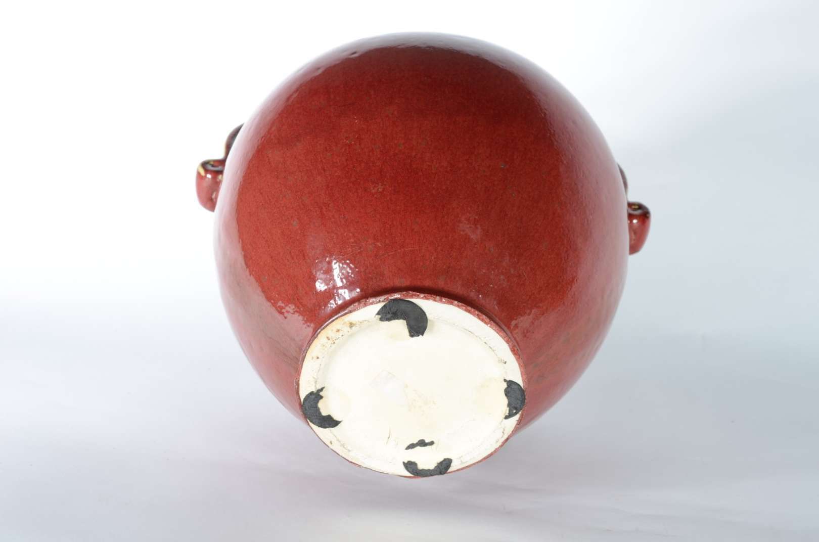 Par de vasos de cloisoné chines, decoração floral em policromia sobre fundo rouge de fer. Bases de madeira.