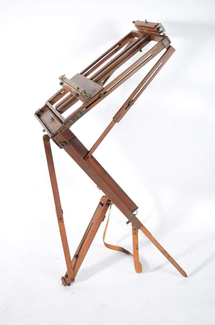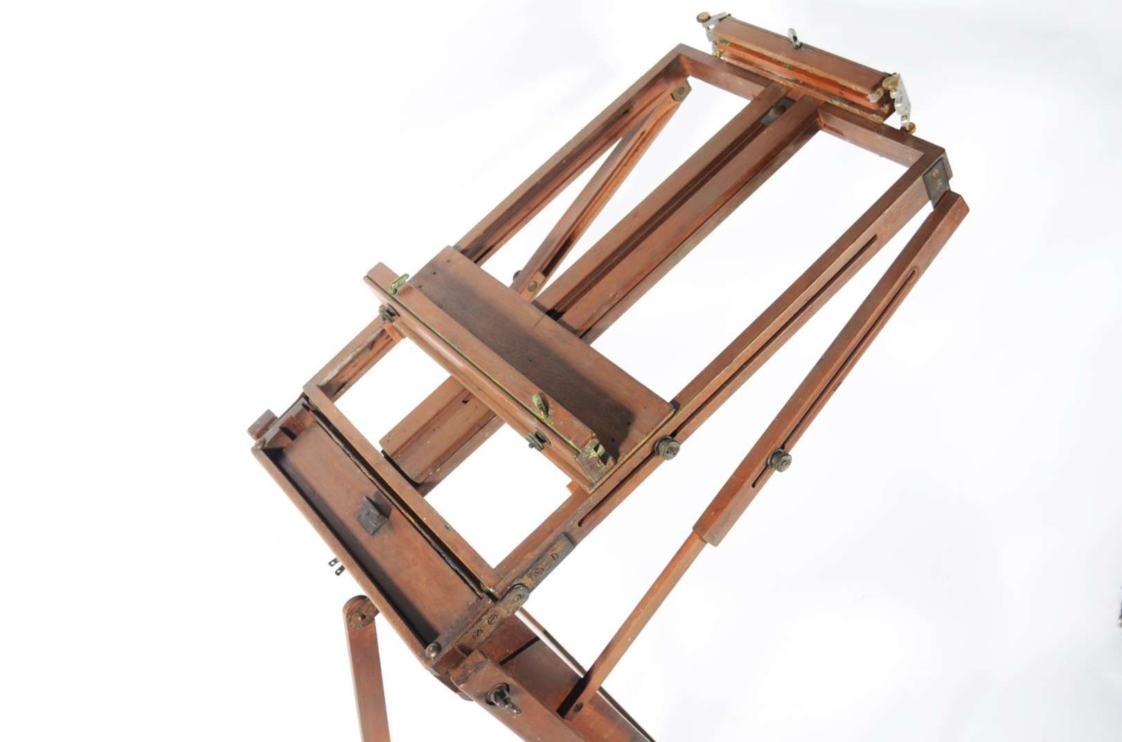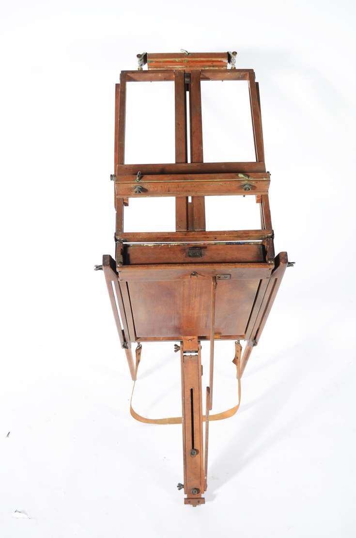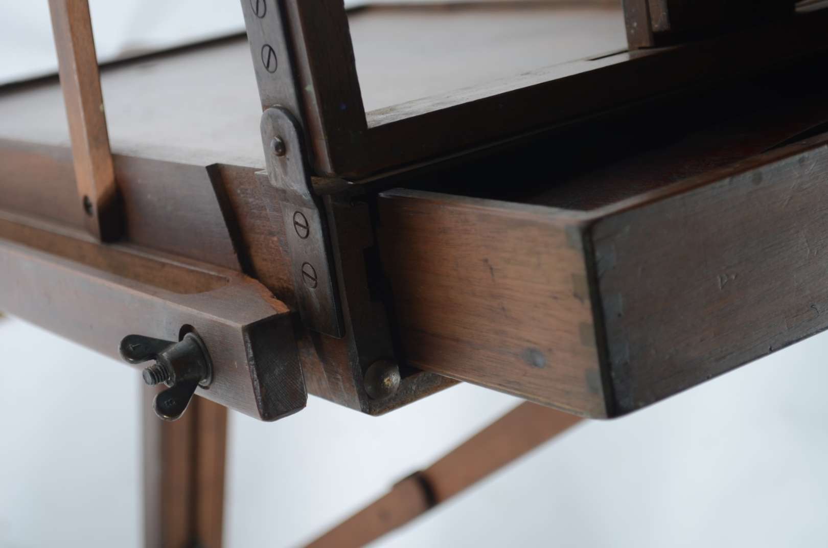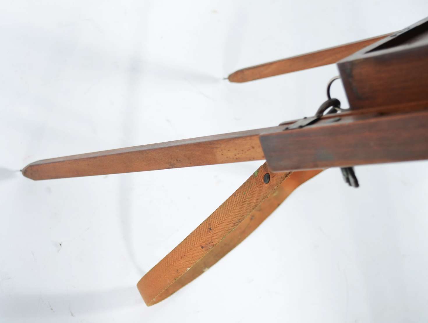 Mesa de fazenda em madeira rústica, dita "de cavalete", tampo liso apoiado em travessões laterais retos. Pernas incli...
