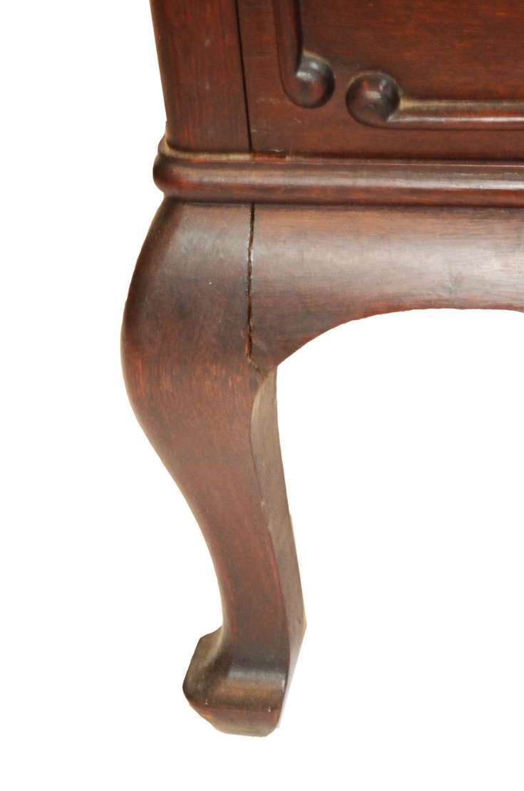 Aparador de madeira nobre patinada, duas pernas arqueadas com entalhes ligadas por trave inferior arrematada por pino...
