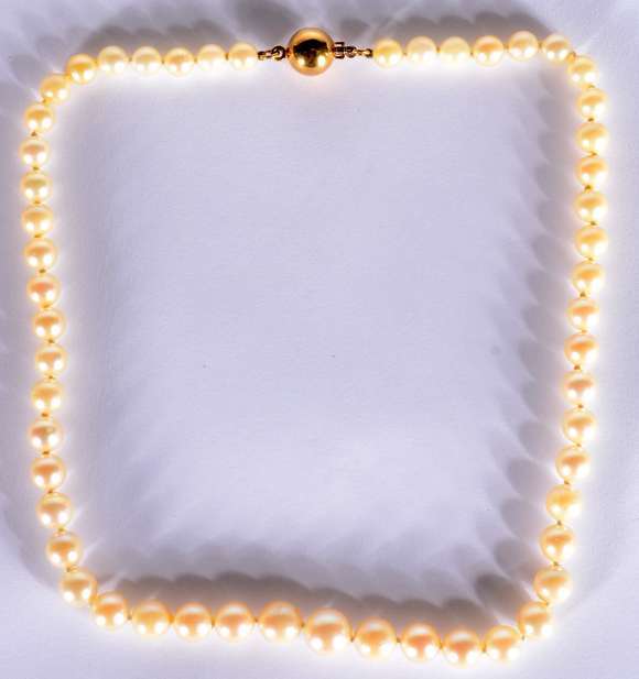 Colar de perolas com fecho feitio "bola" de ouro 18 k. (Por motivos de segurança a peça não se encontra na loja).