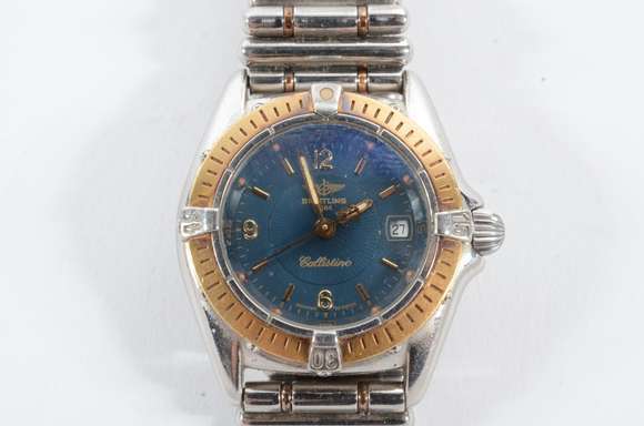 Relógio de pulso Breitling "Callistino" feminino, em aço e ouro, com calendário, movimento a quartzo. Diâmetro da cai...