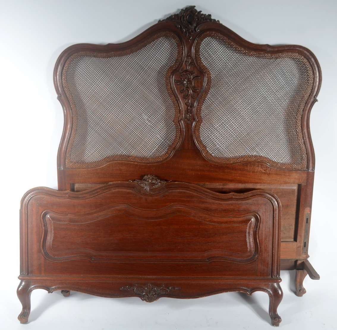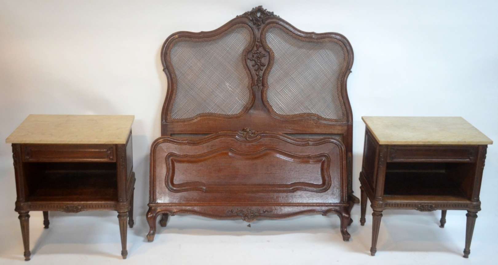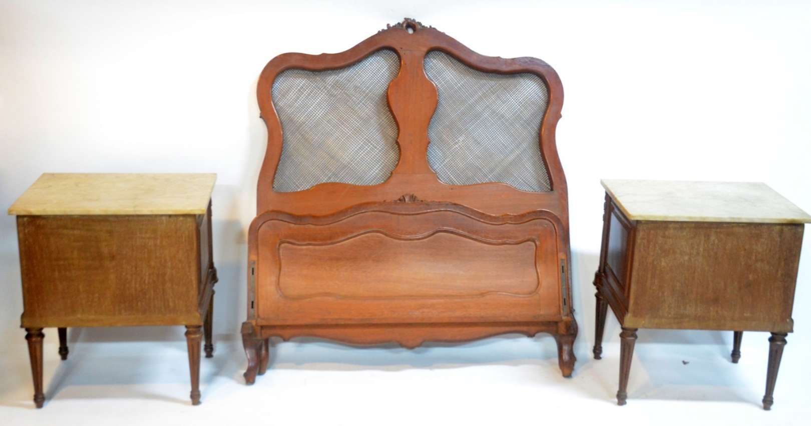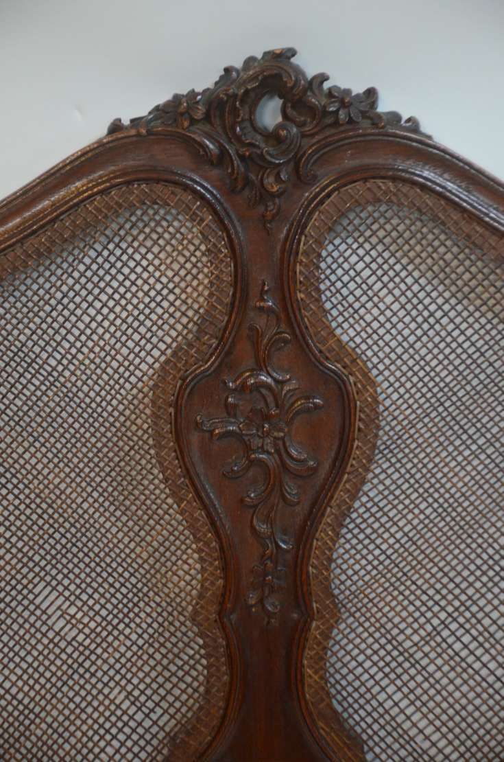 Conjunto de cama de casal com cabeceira na forma de medalhões forrados com palhinha (completa com estrado e laterais)...