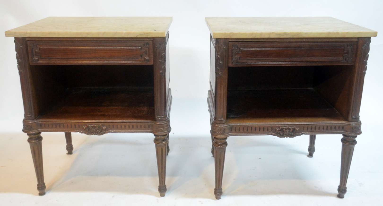 Par de poltronas de madeira nobre, estilo Luis XV, estofadas e forradas em tecido na cor salmon, encostos em capitoné.