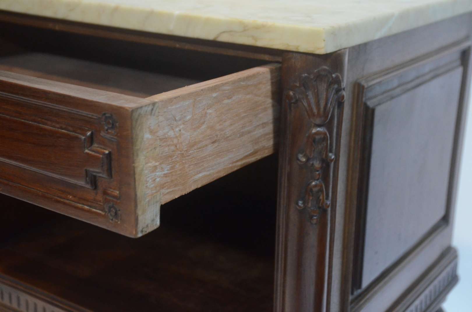 Aparador de madeira nobre patinada, duas pernas arqueadas com entalhes ligadas por trave inferior arrematada por pino...