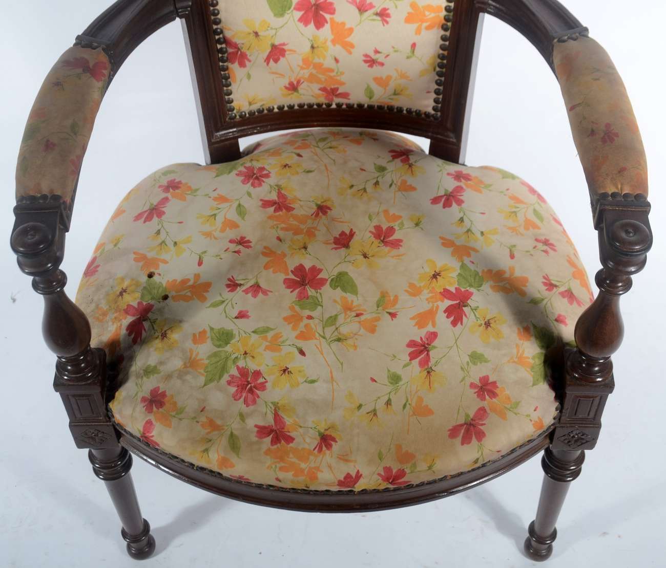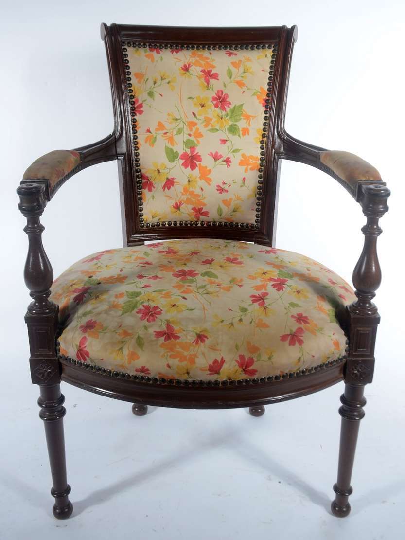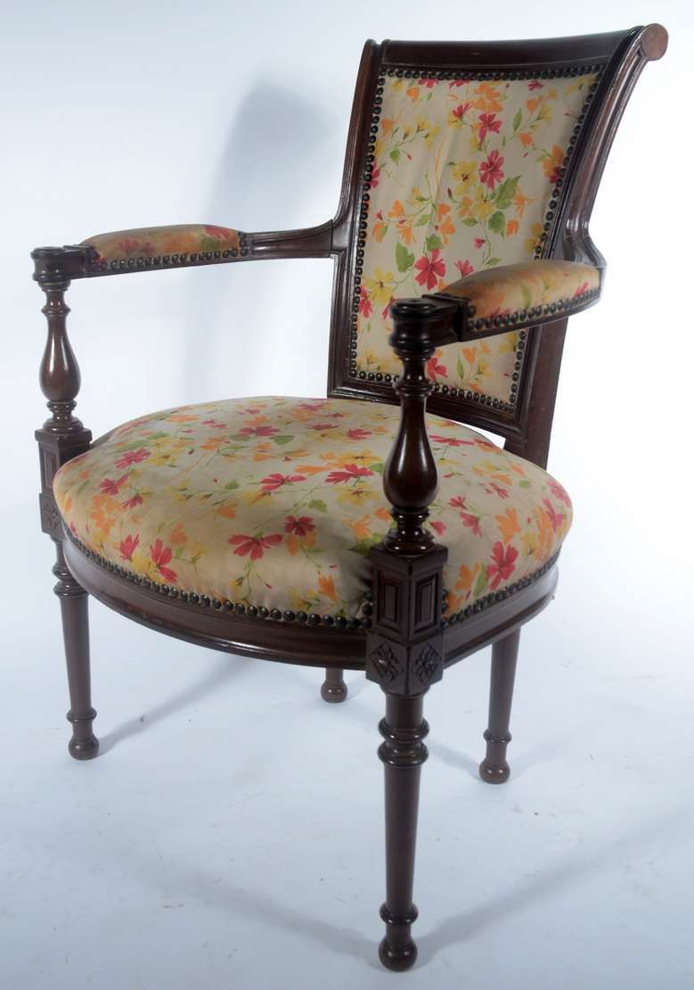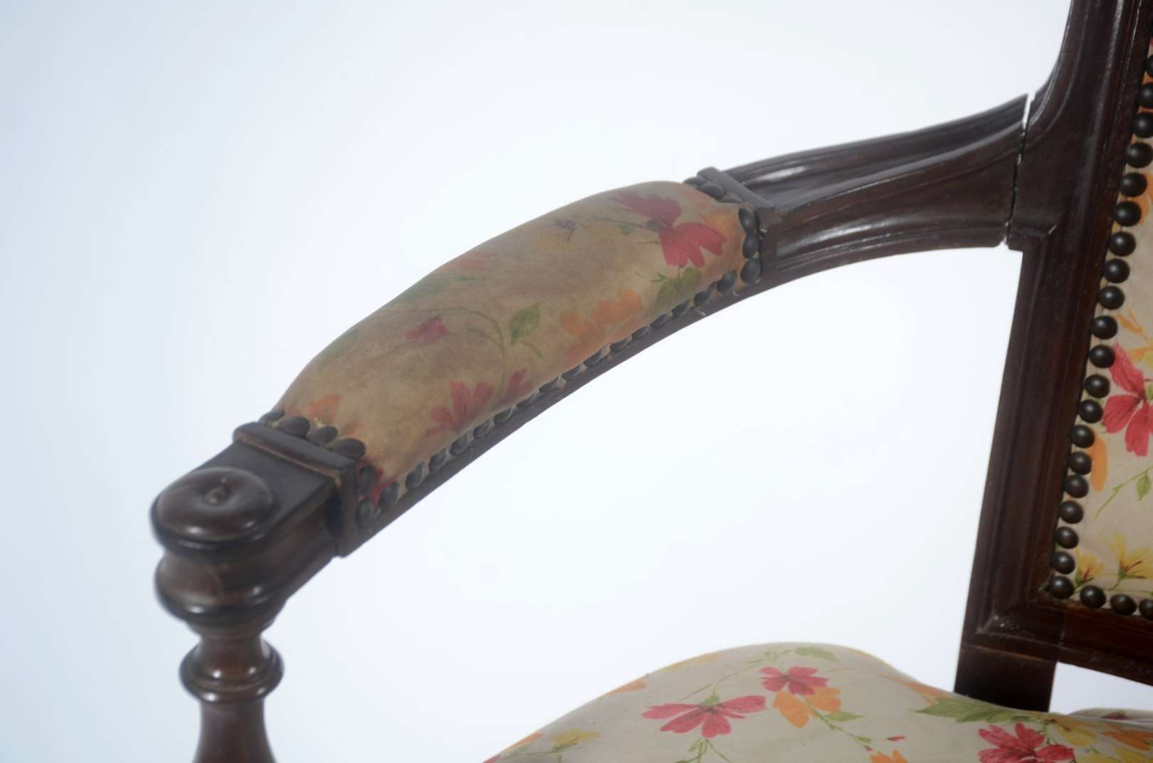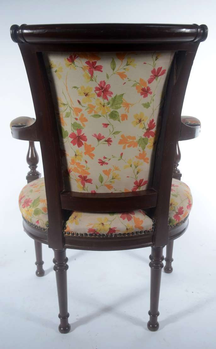 Par de poltronas de madeira nobre, estilo Luis XV, estofadas e forradas em tecido na cor salmon, encostos em capitoné.