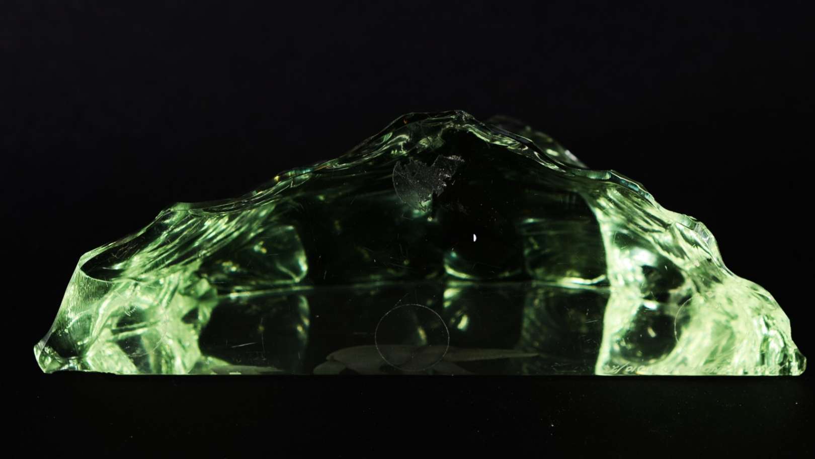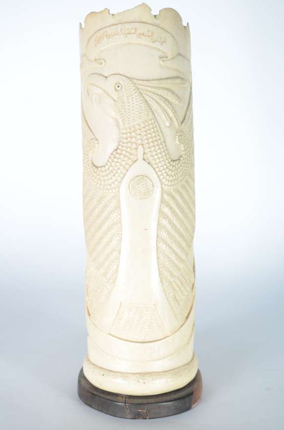 Escultura feita em presa de marfim com pássaro em relevo e inscrições árabes. Base de madeira. Desgastes nas bordas.