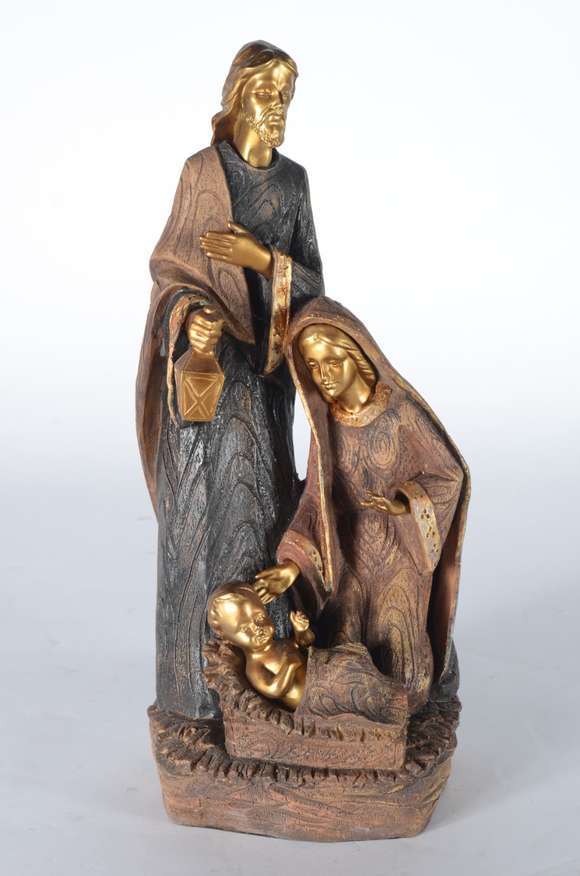 Grupo escultórico representando Sagrada Família de madeira e metal.