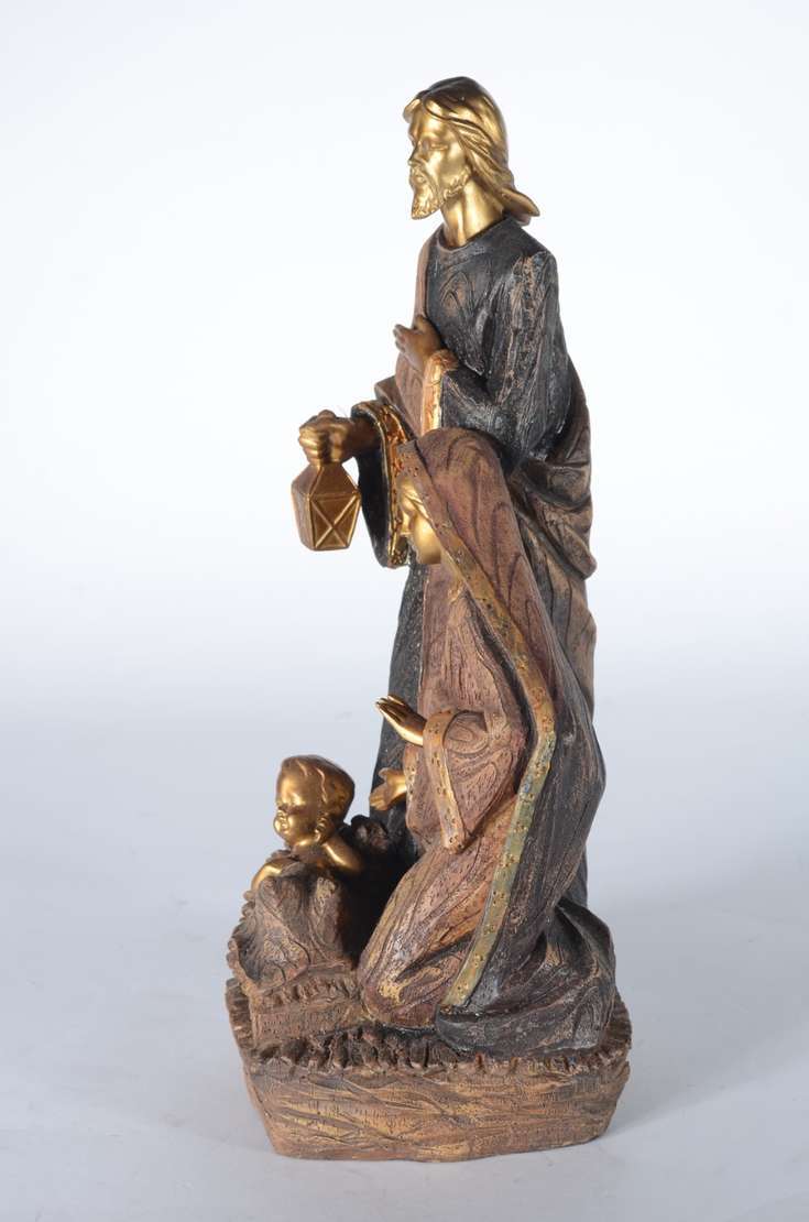 Estatueta/luminária de porcelana policromada representando anjo da guarda.