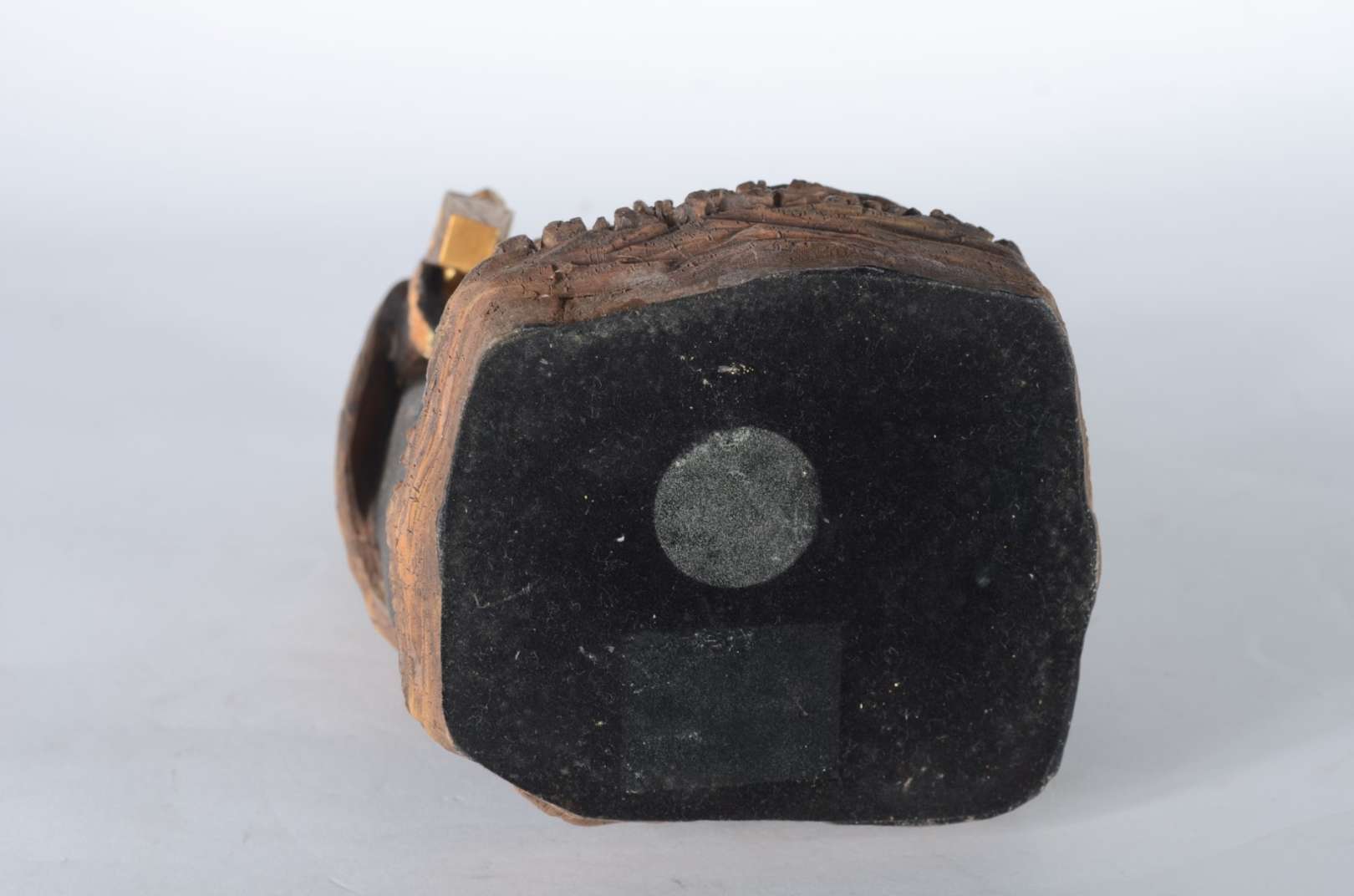 Escultura feita em presa de marfim com pássaro em relevo e inscrições árabes. Base de madeira. Desgastes nas bordas.