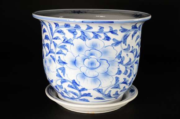 Cachepot com prato de porcelana oriental azul e branca (fio de cabelo no fundo).