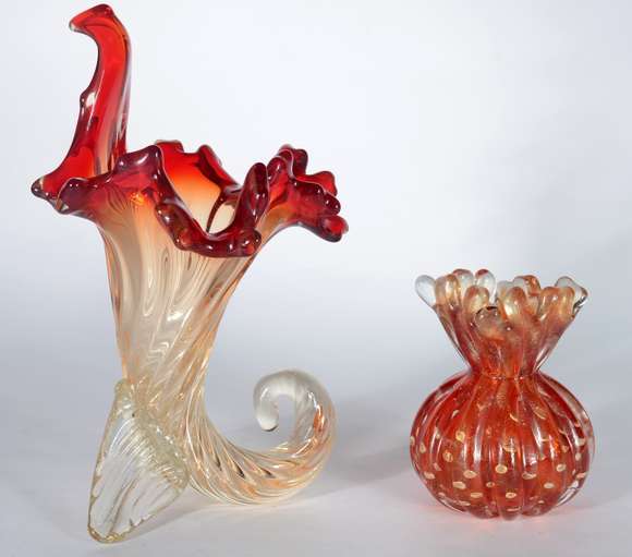 Duas peças de vidro decorativo, sendo: cornucópia em degradê e pequeno vaso gomado com pó de ouro. Cornucópia com las...