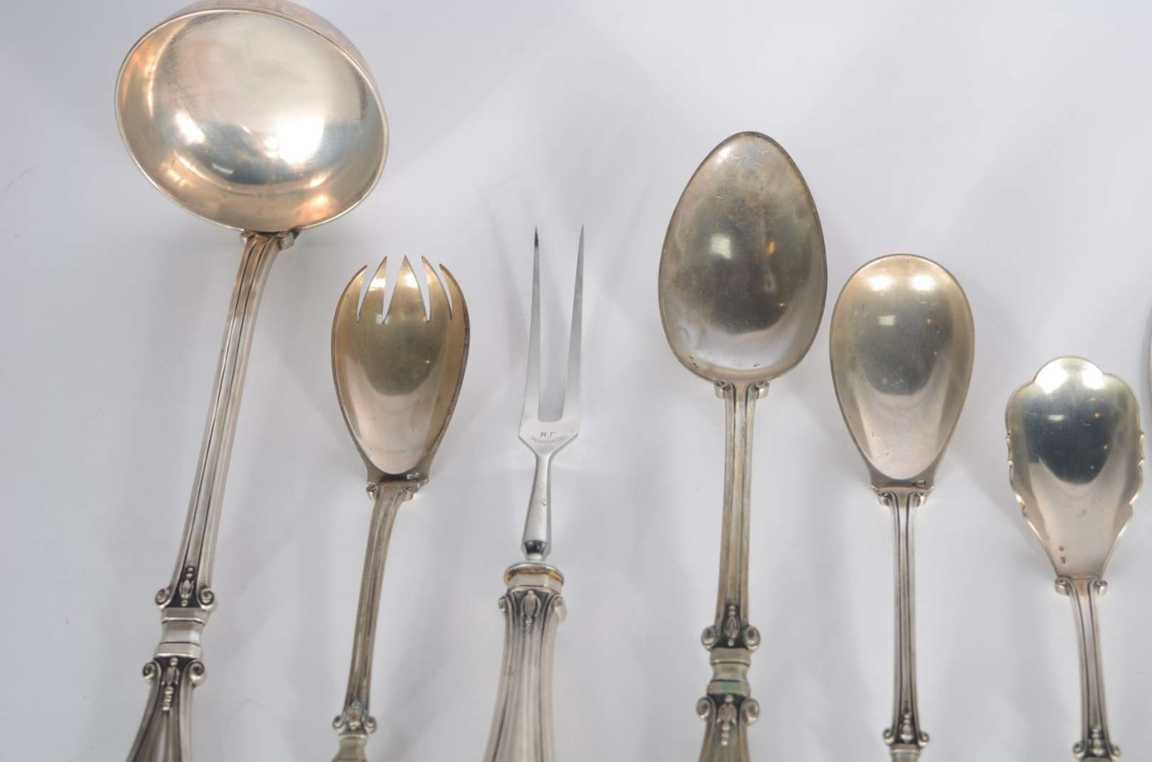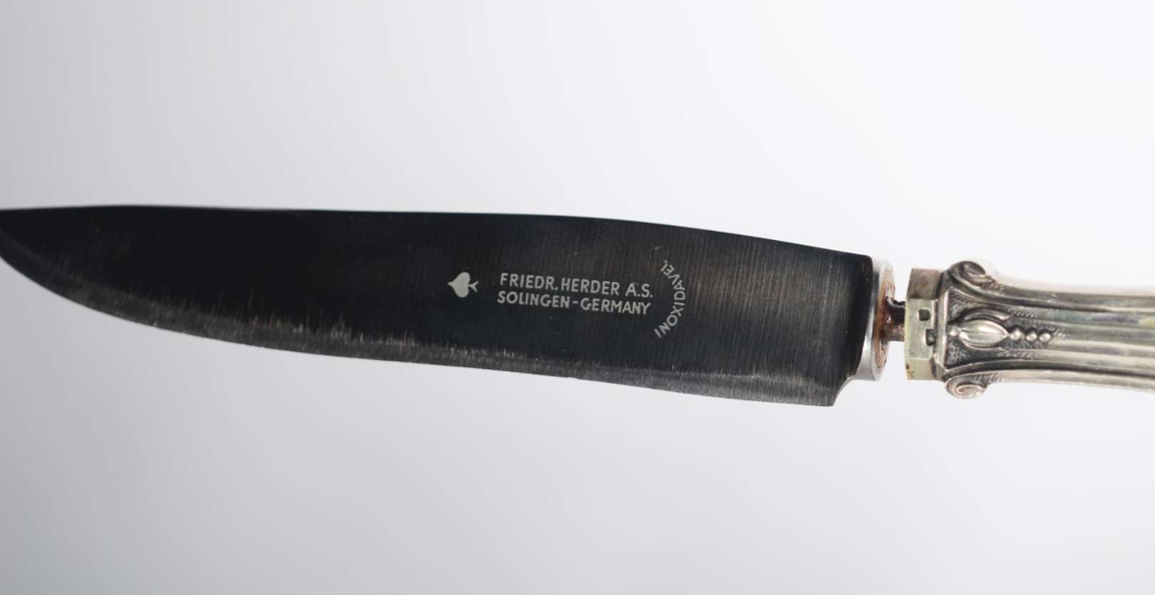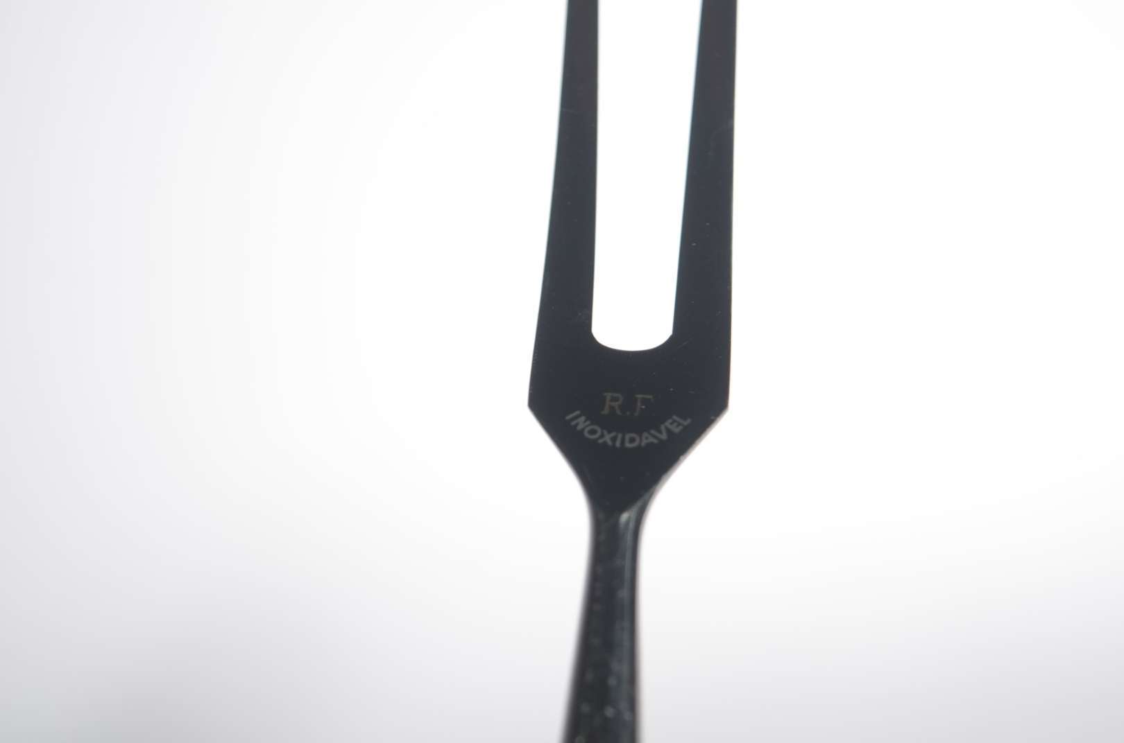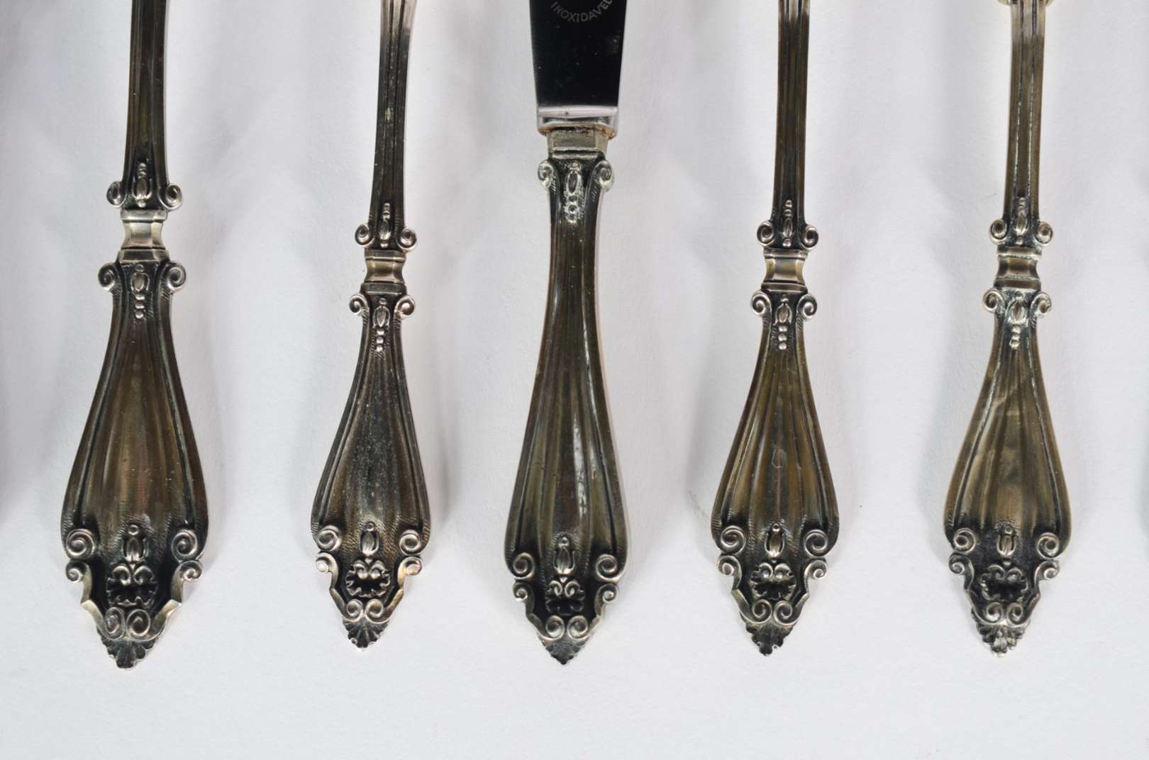 Faqueiro de prata de lei contrastada, completo para 12 pessoas, composto de: 12 colheres, 12 garfos, 12 facas grandes; 12 colheres, 12 garfos, 12 facas sobremesa; 12 garfos, 12 facas para peixe; 12 colheres de chá; 12 colheres de café e 16 peças de servir. Total: 136 peças. Peso da prata: 4.550 g./ Peso total das peças com lâminas: 2.000 g./ Peso total do faqueiro: 6.550 g. (Por motivos de segurança a peça não se encontra na loja).