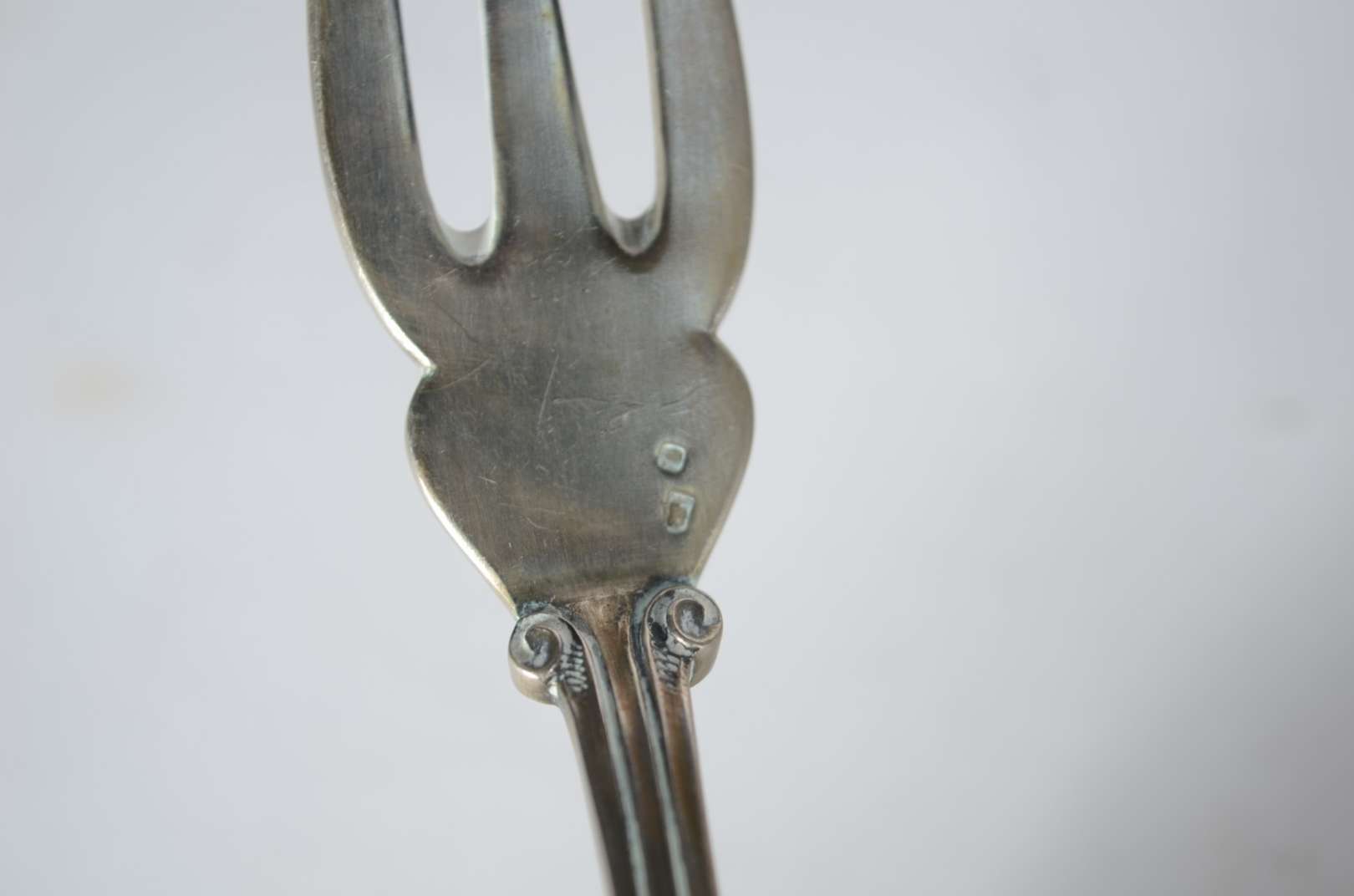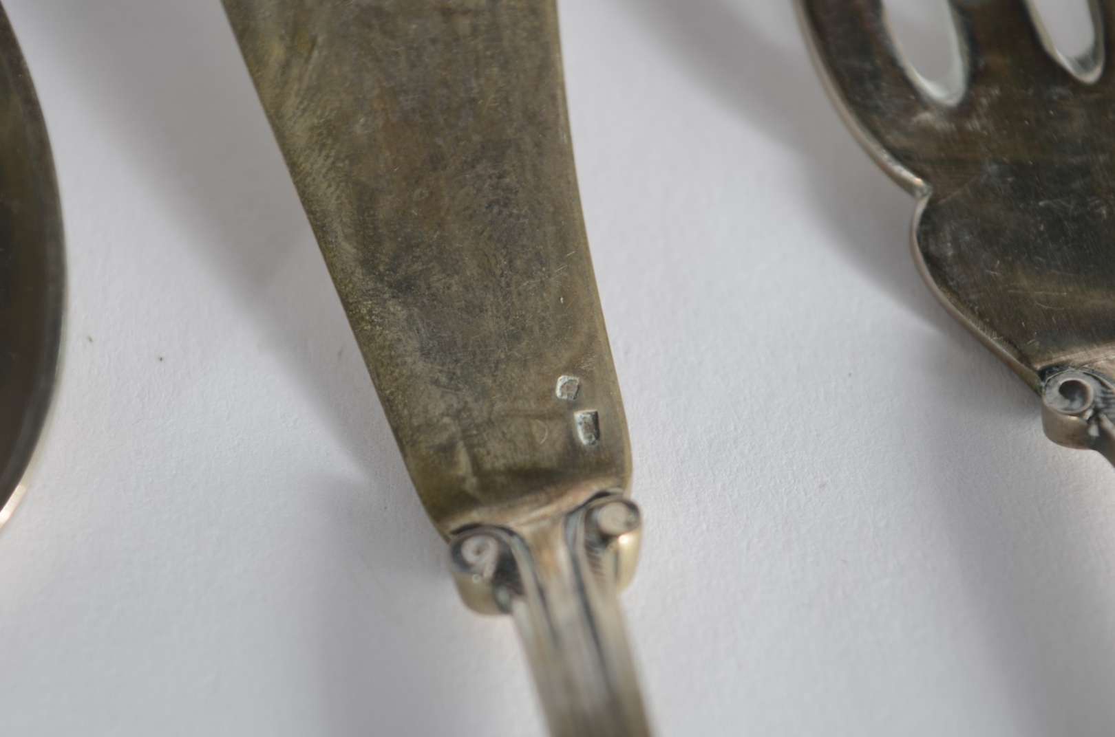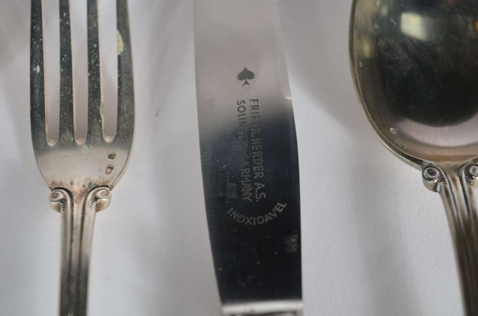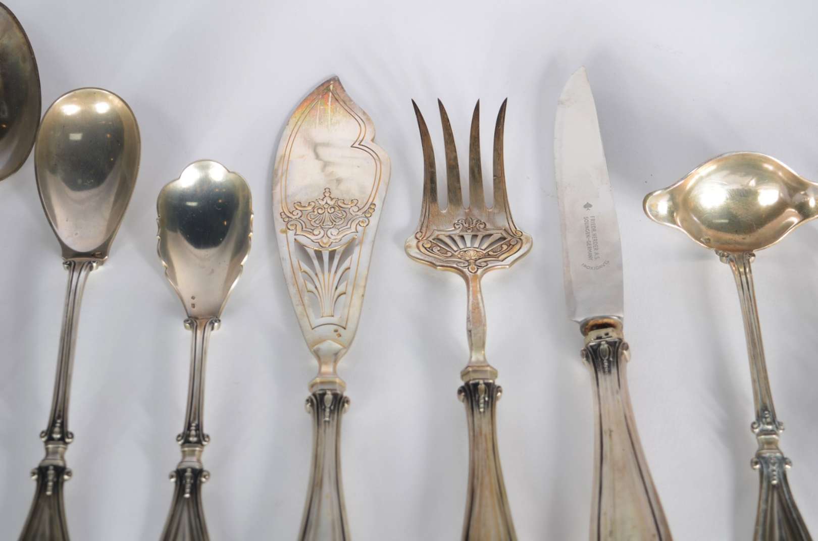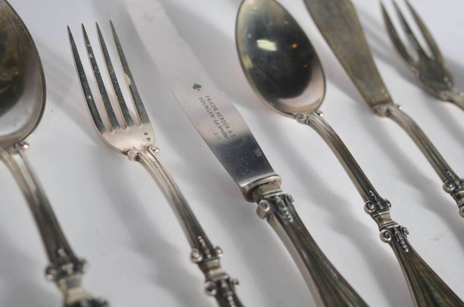 Faqueiro de prata de lei contrastada, completo para 12 pessoas, composto de: 12 colheres, 12 garfos, 12 facas grandes; 12 colheres, 12 garfos, 12 facas sobremesa; 12 garfos, 12 facas para peixe; 12 colheres de chá; 12 colheres de café e 16 peças de servir. Total: 136 peças. Peso da prata: 4.550 g./ Peso total das peças com lâminas: 2.000 g./ Peso total do faqueiro: 6.550 g. (Por motivos de segurança a peça não se encontra na loja).