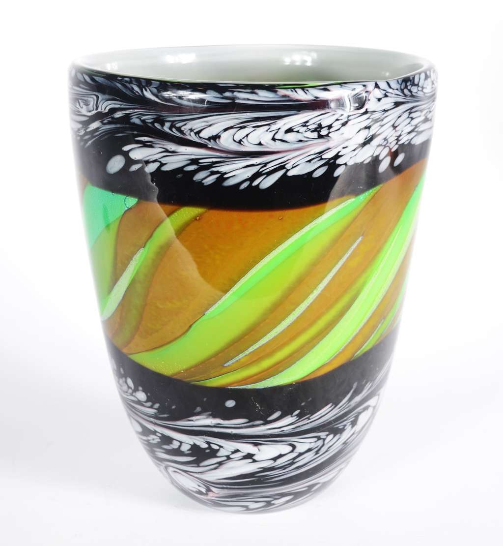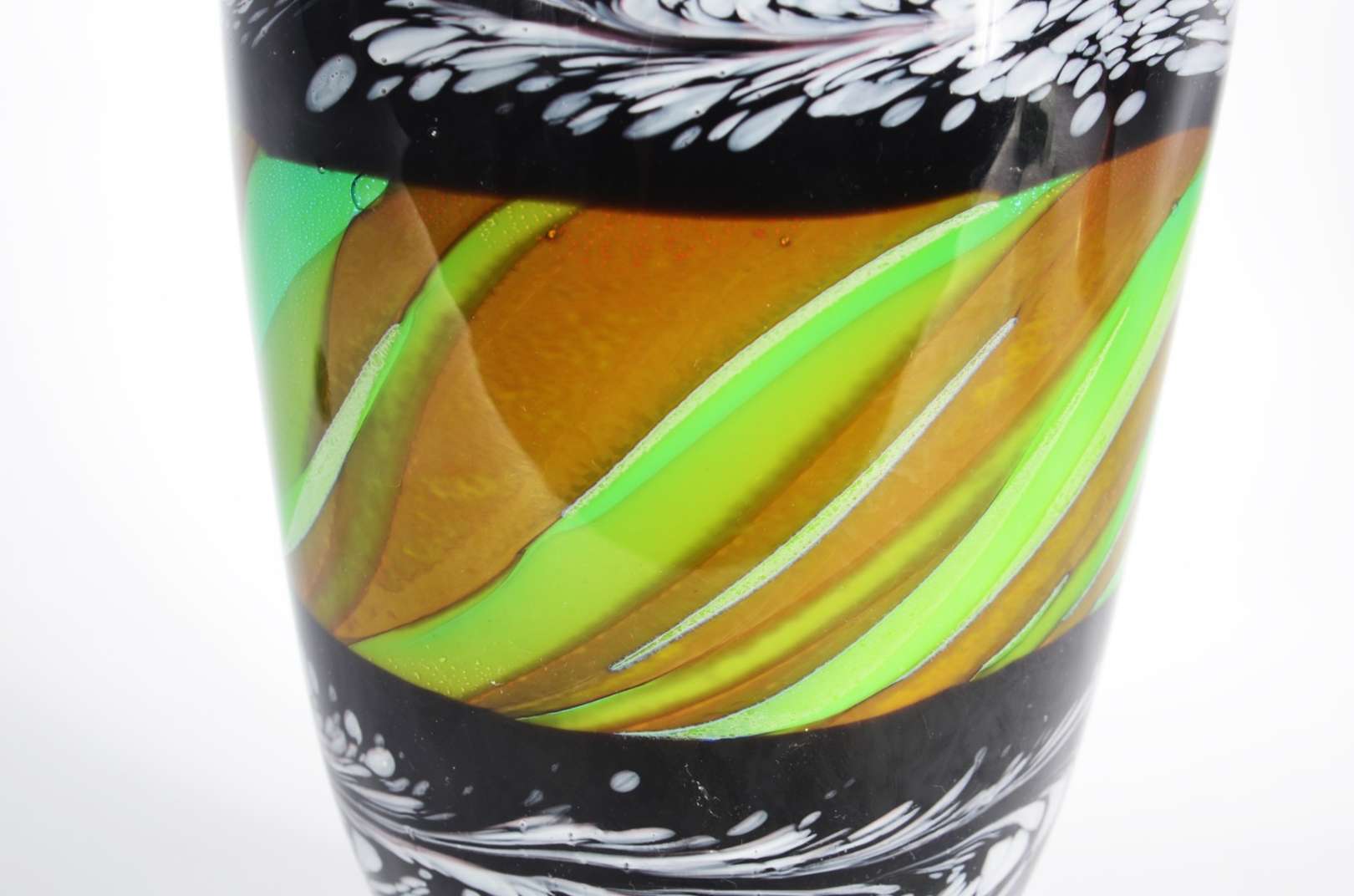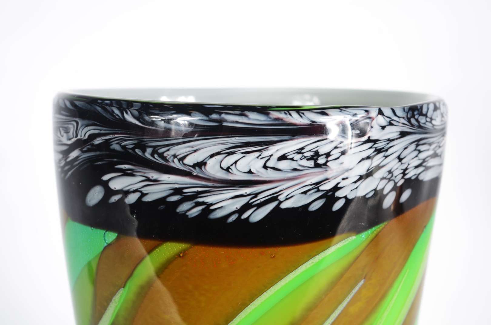 Vaso de murano italiano na cor laranja com pó de ouro, trabalhado em gomos com alças laterais feitio "laçarotes". Tri...