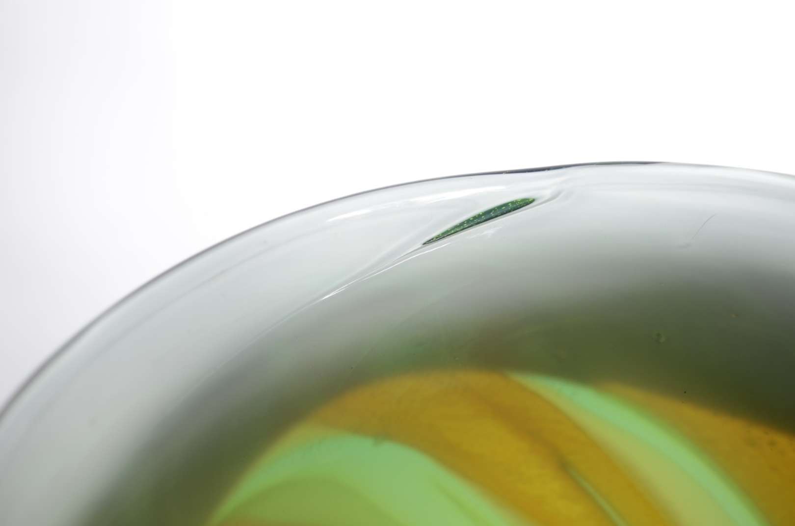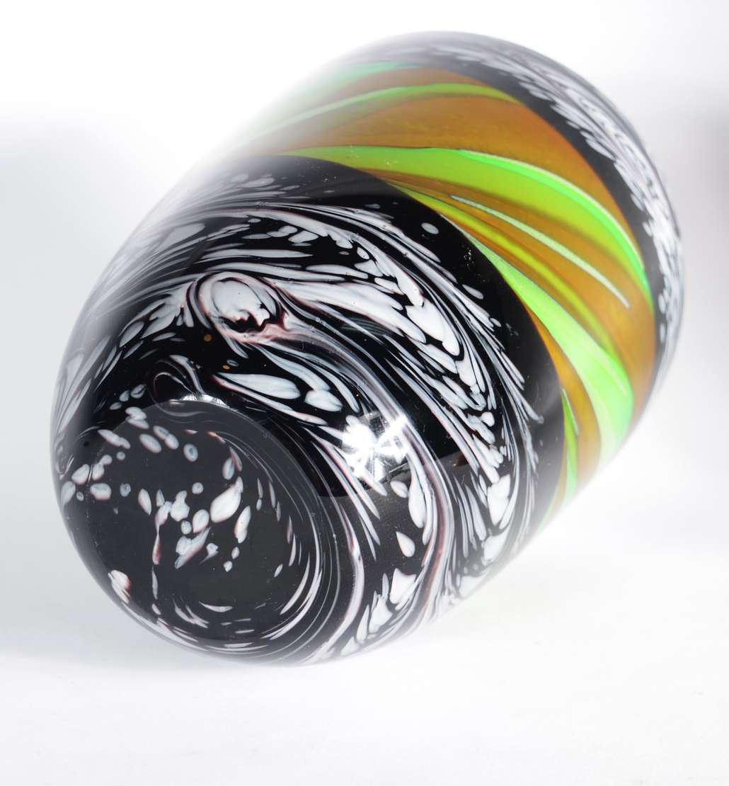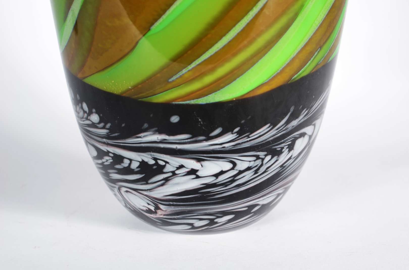 Vaso de murano italiano na cor laranja com pó de ouro, trabalhado em gomos com alças laterais feitio "laçarotes". Tri...