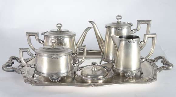 Baixela para chá e café de metal prateado Fracalanza, composto de: 2 bules, leiteira, açucareiro, manteigueira (falta...