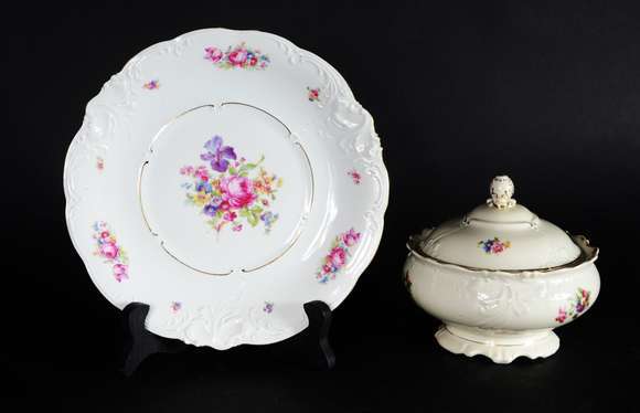 Duas peças de porcelana KPM, sendo uma potiche de porcelana alemã na cor bege com flores em policromia e friso dourad...