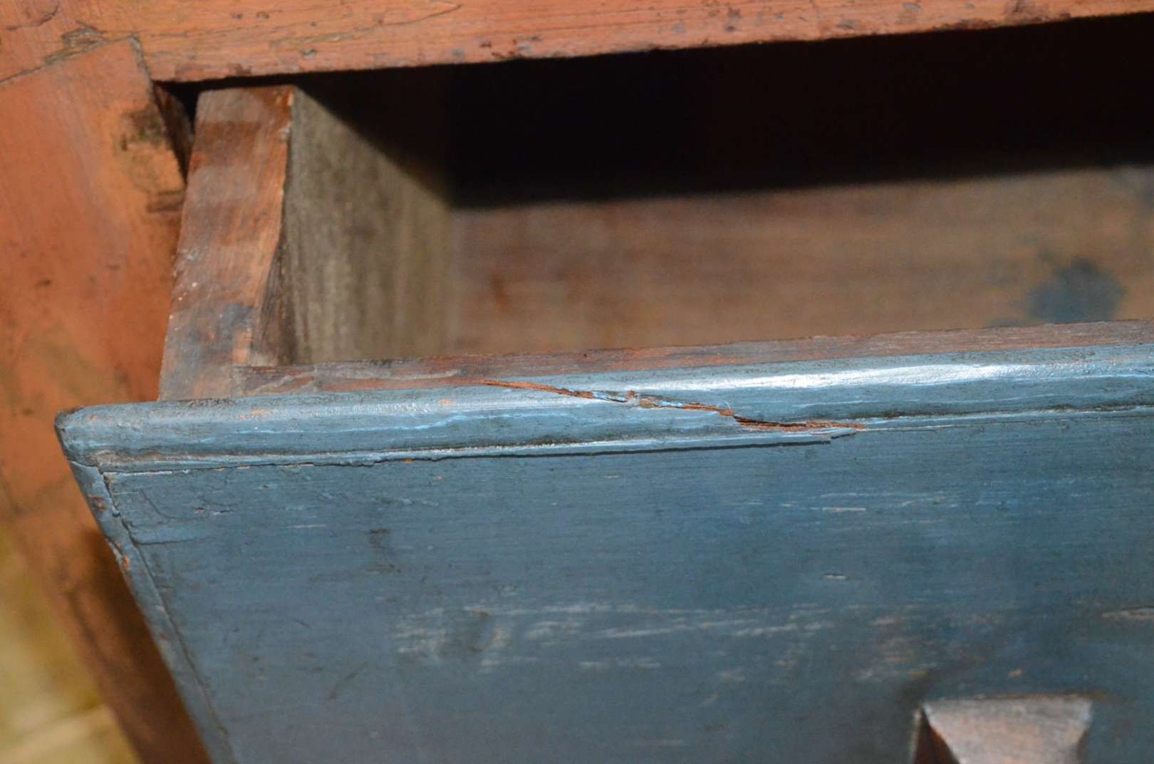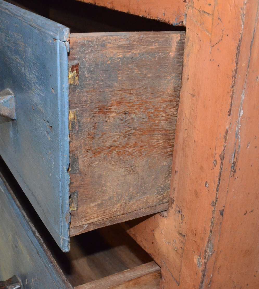 Baú de madeira e couro com tacheados, interior forrado. Desgastes do tempo.