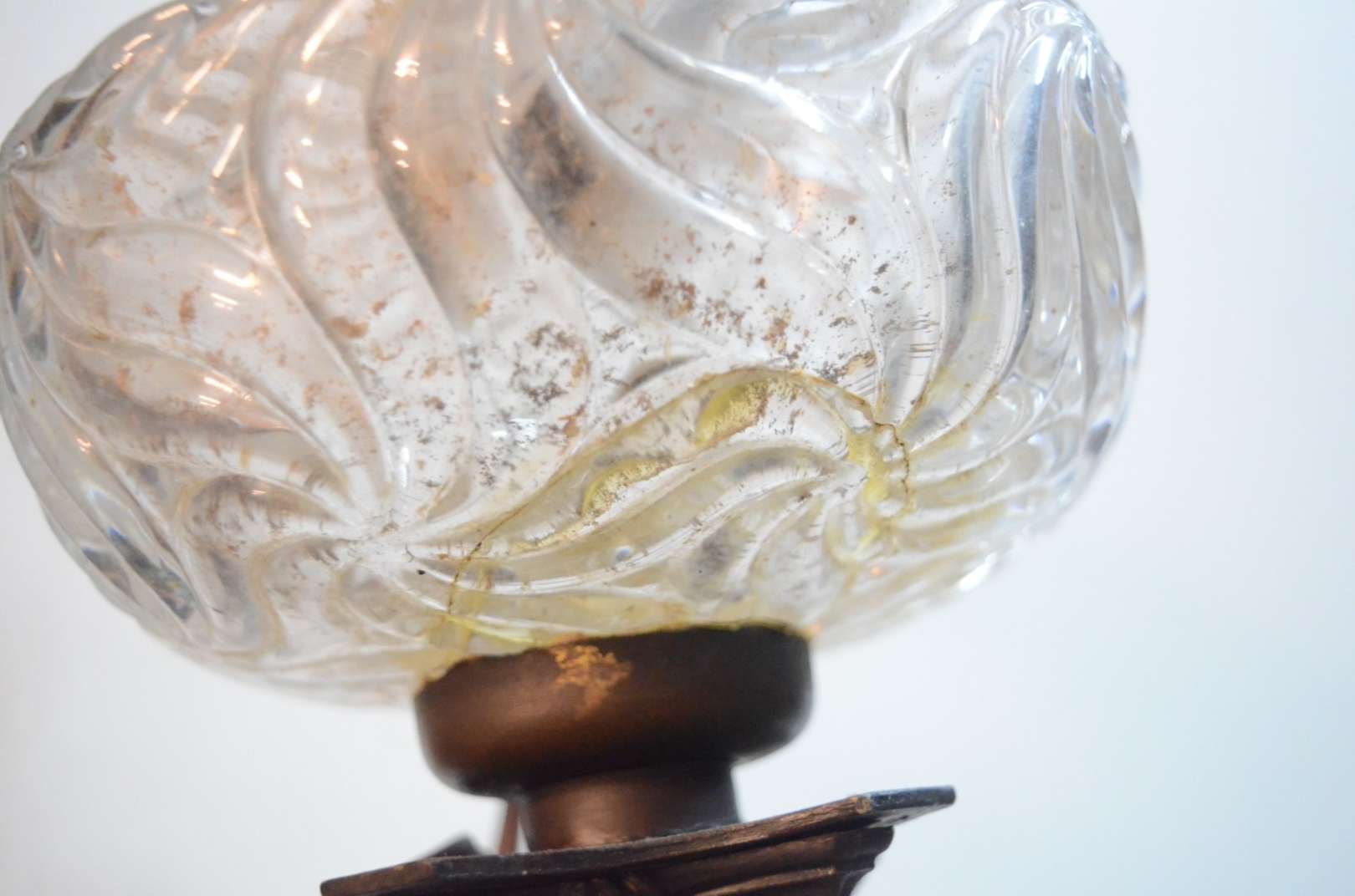 Luminária de pé com duas hastes de metal e cúpula de vidro azul. Oxidação na base.