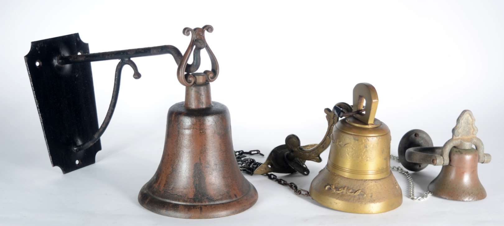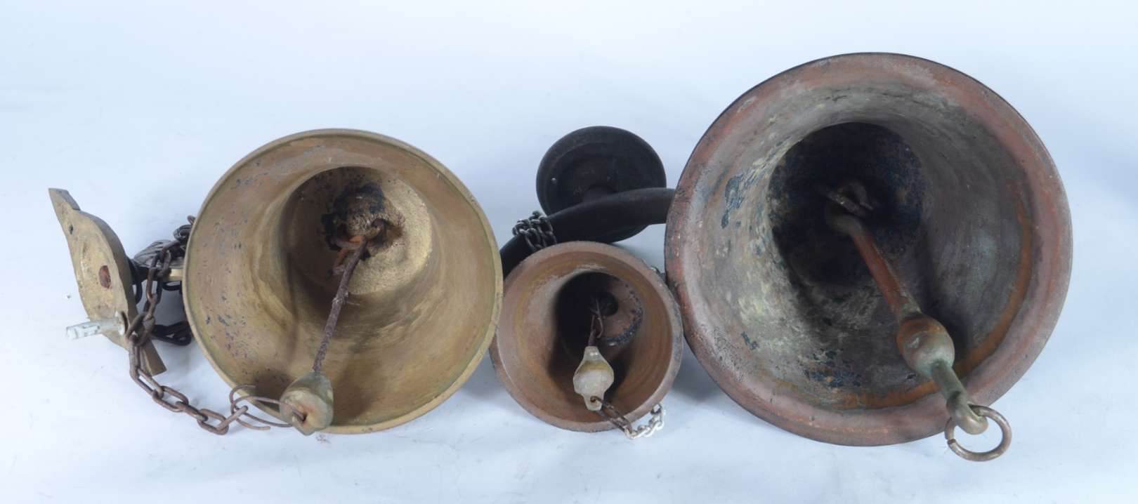 Três sinos de bronze de diversas procedências e modelos. Desgastes.