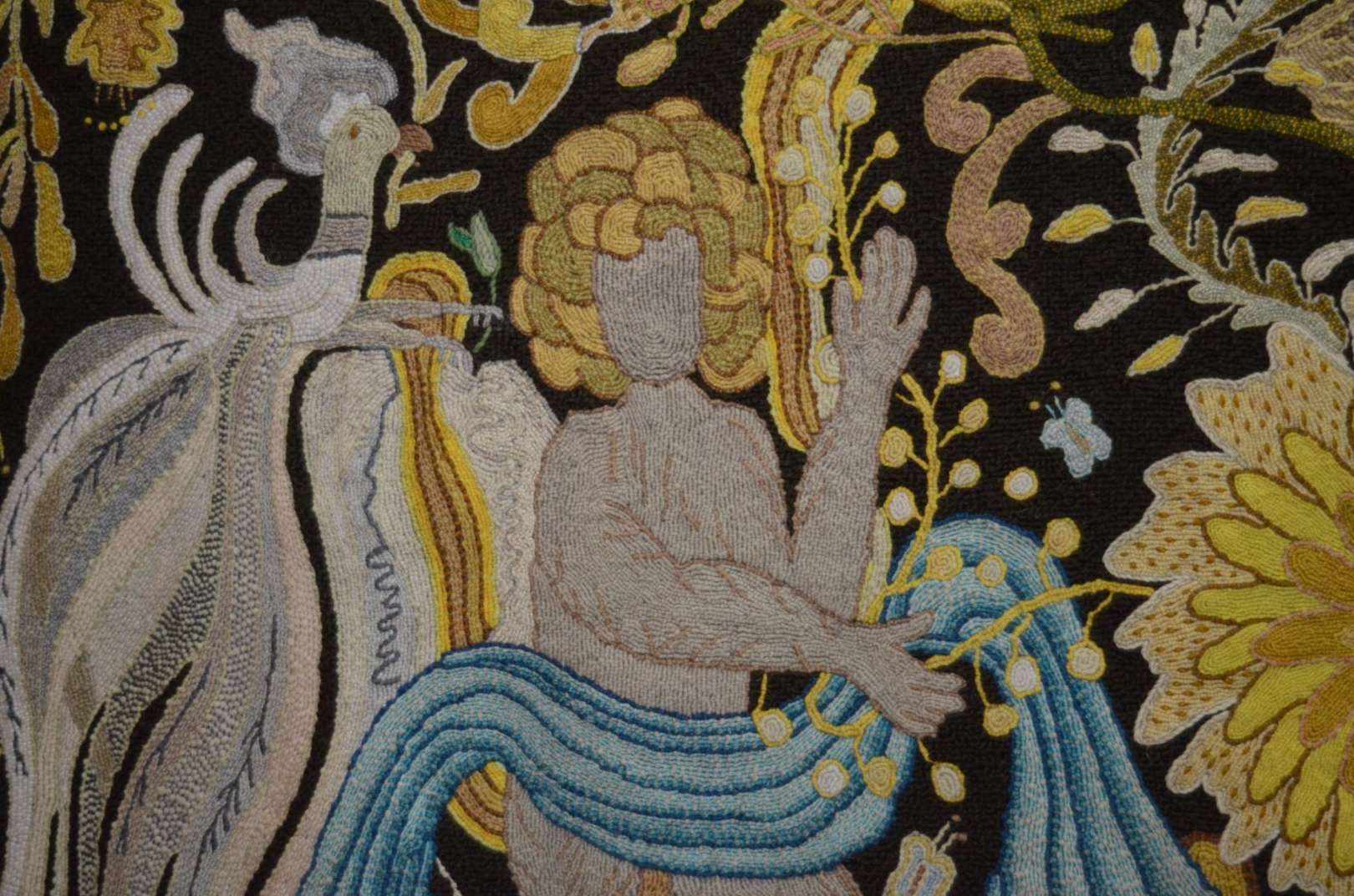 Duas tapeçarias, sendo uma assinada A.G; e, outra assinada Joana de Azevedo Moura.