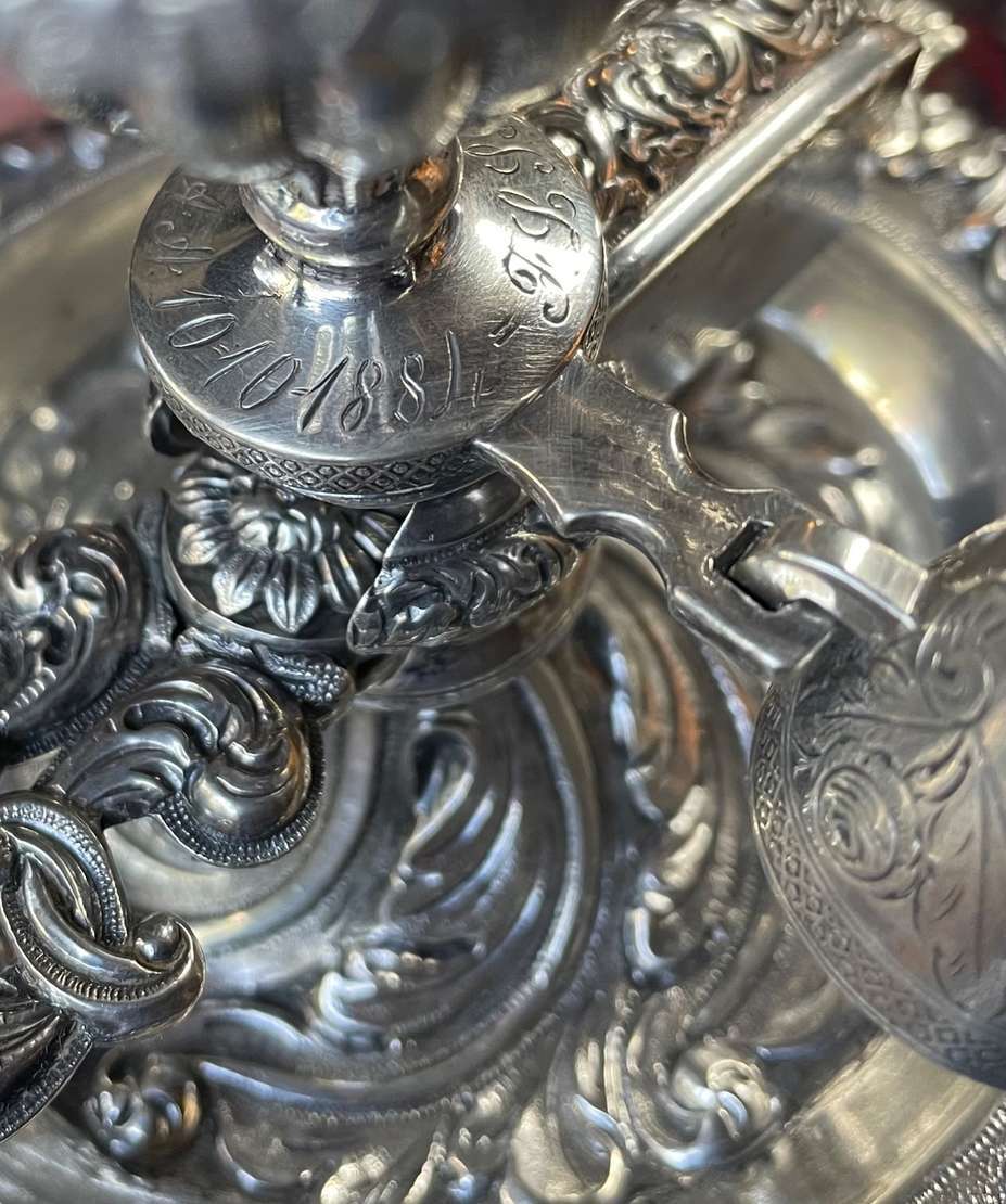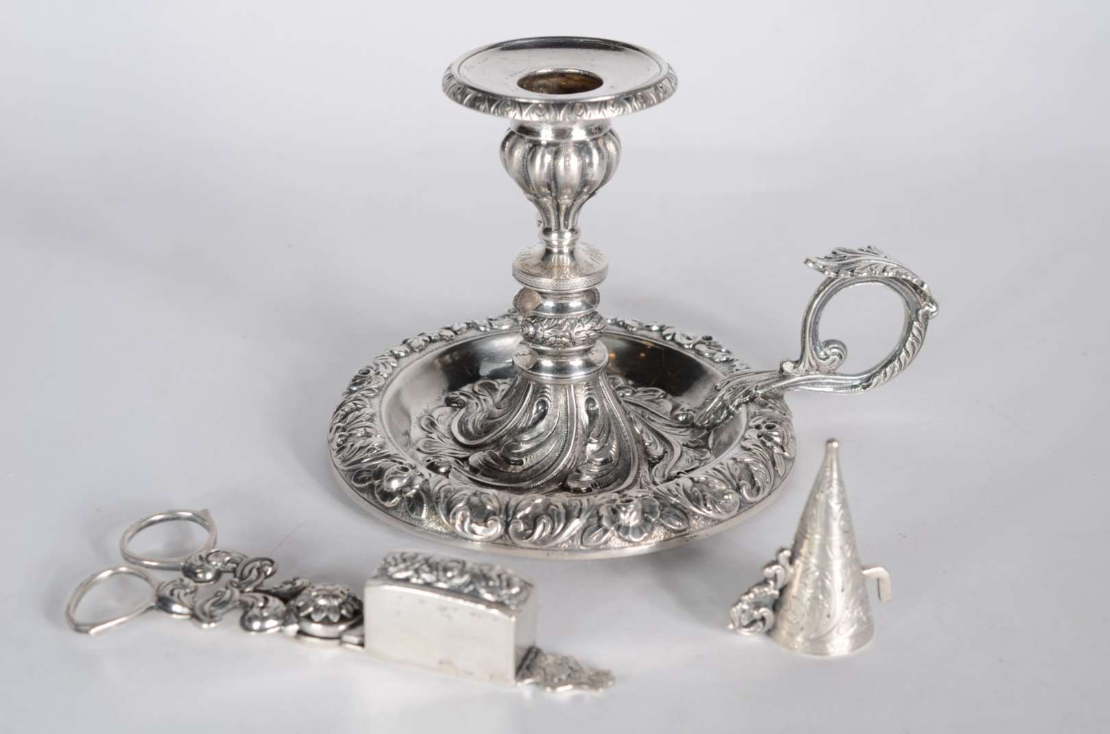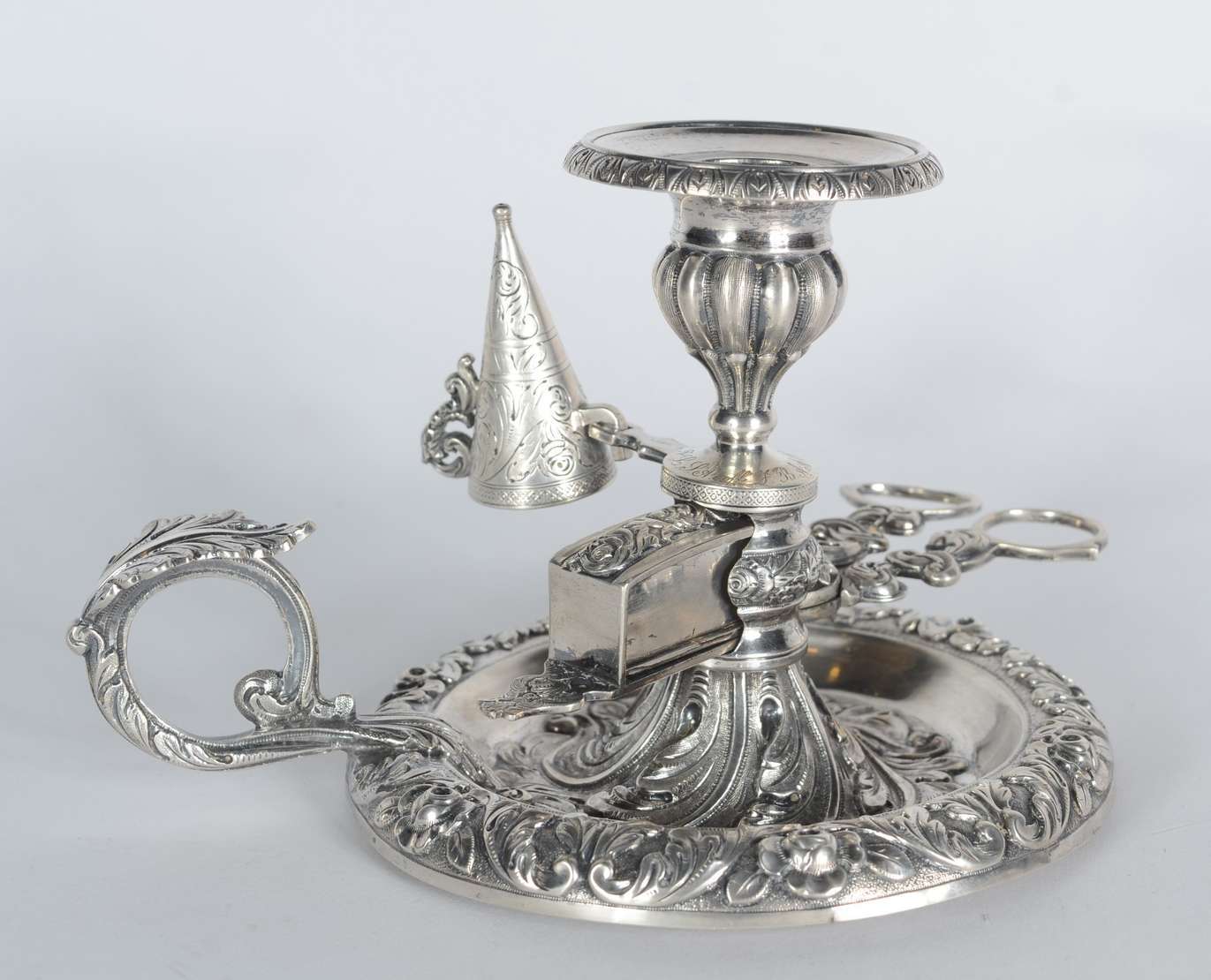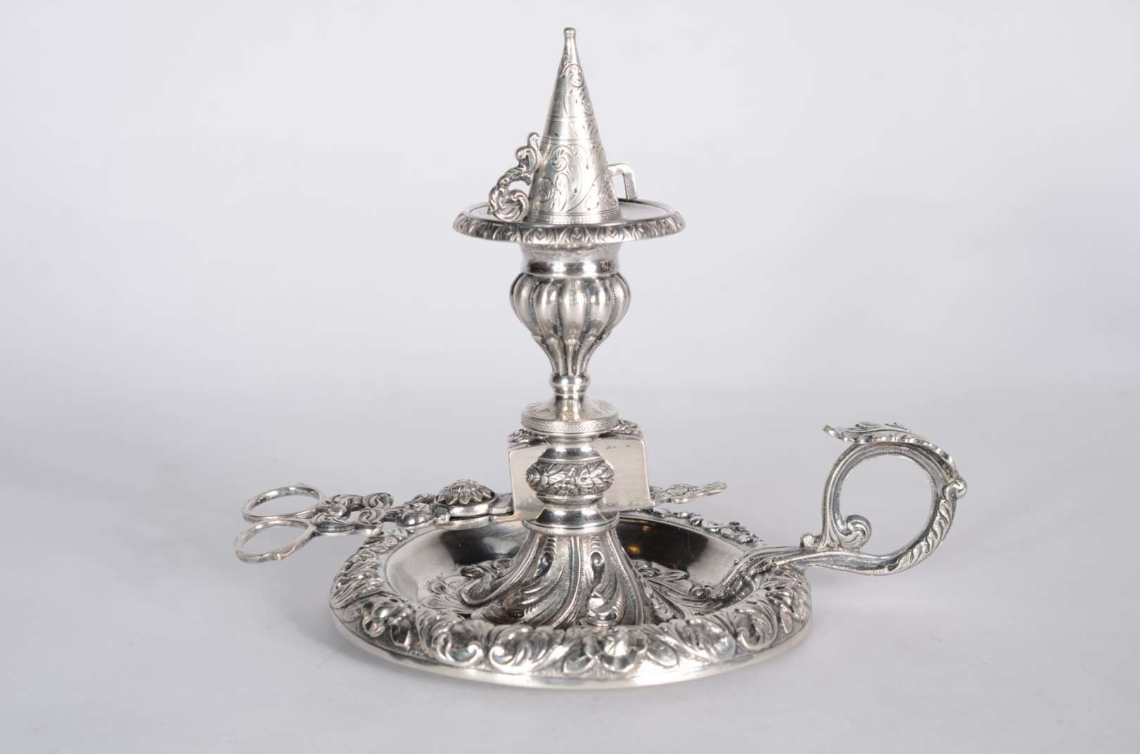 Rara palmatória com tesoura espivitadeira e apagador de vela em prata portuguesa, contraste de Lisboa, século XIX. Inscrições ao centro da peça e data de 10/10/1884. Peso da prata: 420 g. (Por motivos de segurança a peça não se encontra na loja)