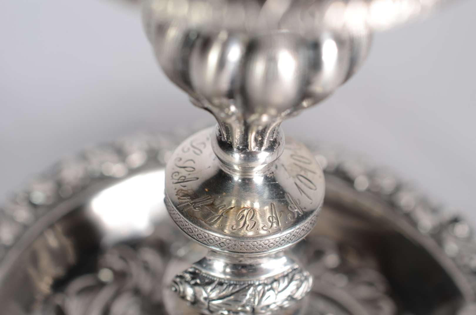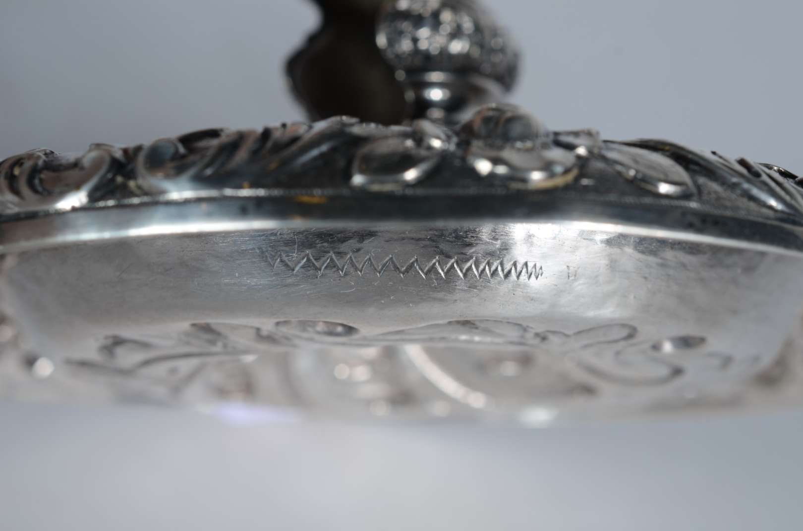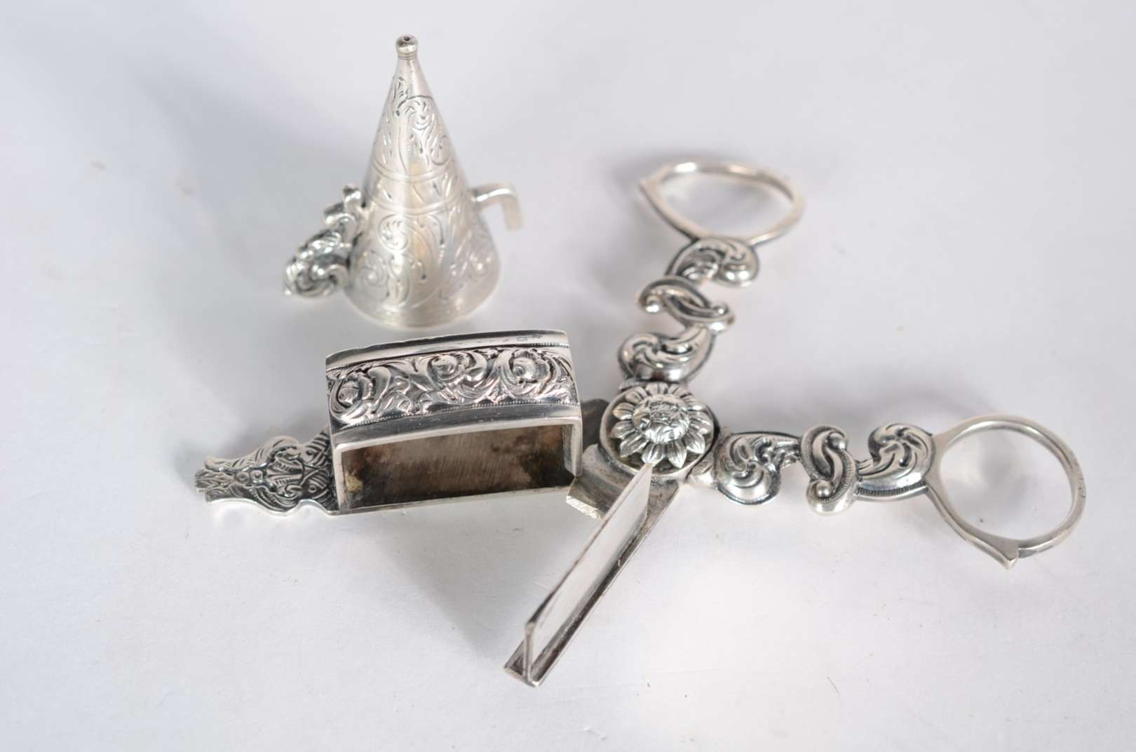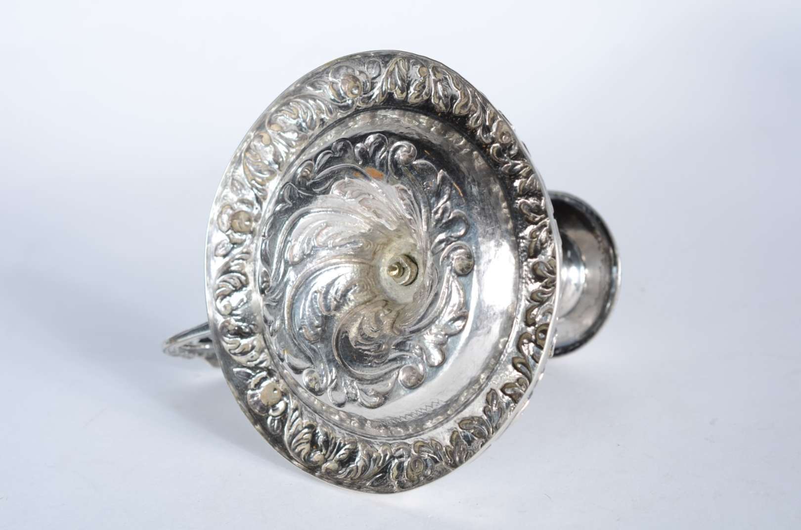 Rara palmatória com tesoura espivitadeira e apagador de vela em prata portuguesa, contraste de Lisboa, século XIX. Inscrições ao centro da peça e data de 10/10/1884. Peso da prata: 420 g. (Por motivos de segurança a peça não se encontra na loja)