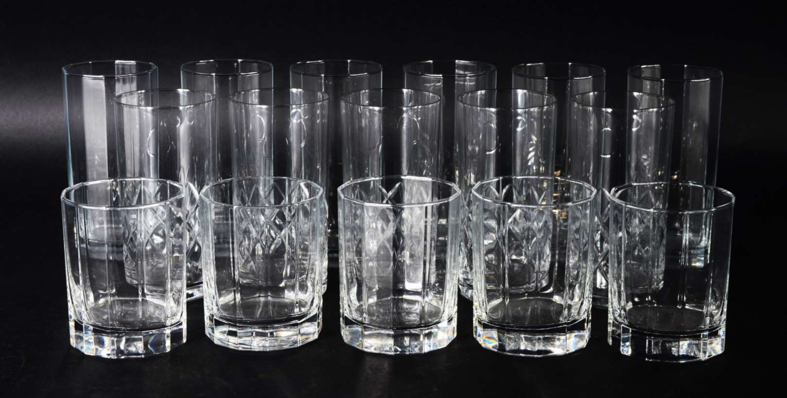 Conjunto com 12 copos baixos de cristal lapidado. Acompanham 6 copos para refresco de cristal Strauss lapidado em fri...